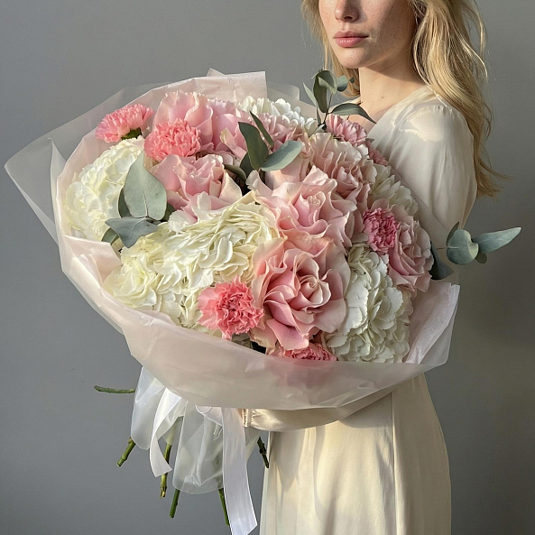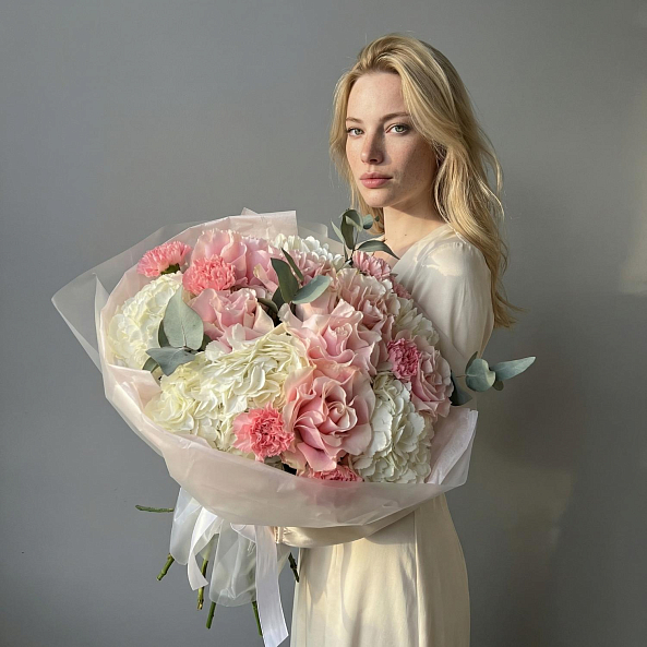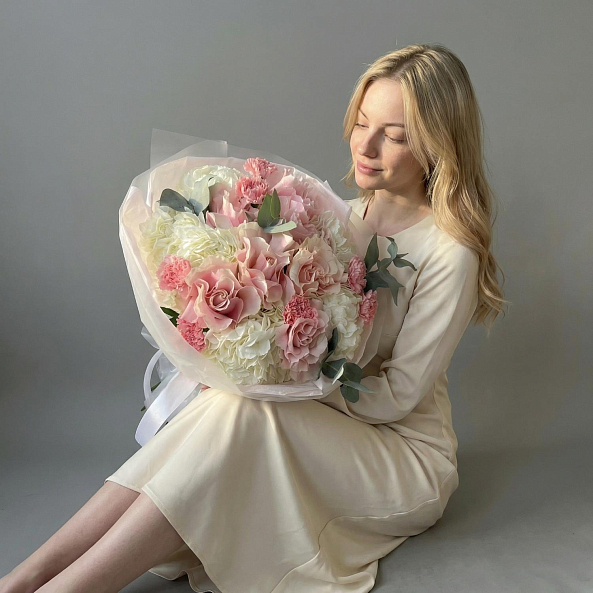 Персиково-розовые розы, белая гортензия и розовые гвоздики — это не просто букет, а целая история. Идеален для тех, кто хочет подарить не просто цветы, а целое настроение.