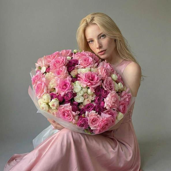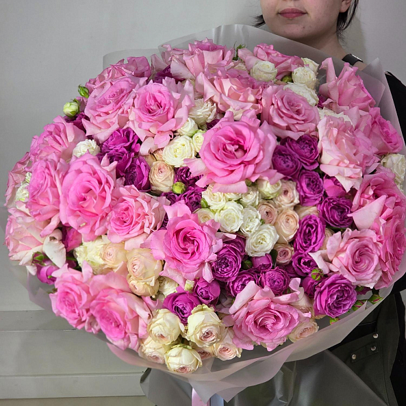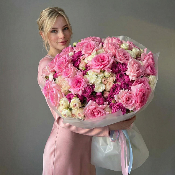 Этот изысканный букет — воплощение нежности и роскоши, где французские розовые розы и пышные кустовые пионовидные розы сливаются в гармоничную композицию. Каждый лепесток, словно окутанный утренним туманом, переливается оттенками розового — от нежного персикового до глубокого малинового, создавая ощущение живого заката. Пышные бутоны пионовидных роз придают объему и воздушности, а изысканные французские розы добавляют элегантности и утонченности. Аккуратные листья зелени придают композиции естественность, подчеркивая природную красоту. Упакованный в прозрачную кальку с атласной лентой в розово-голубой гамме, букет выглядит лаконично и стильно, идеально дополняя любой образ — от романтического до торжественного.