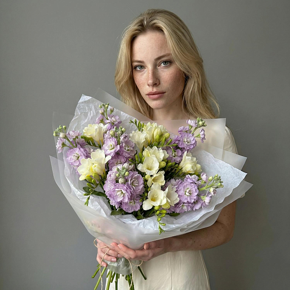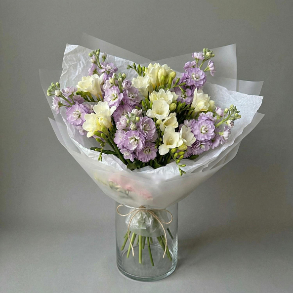 Букет цветов. Фрезия Белая, Маттиола Лавандовая.