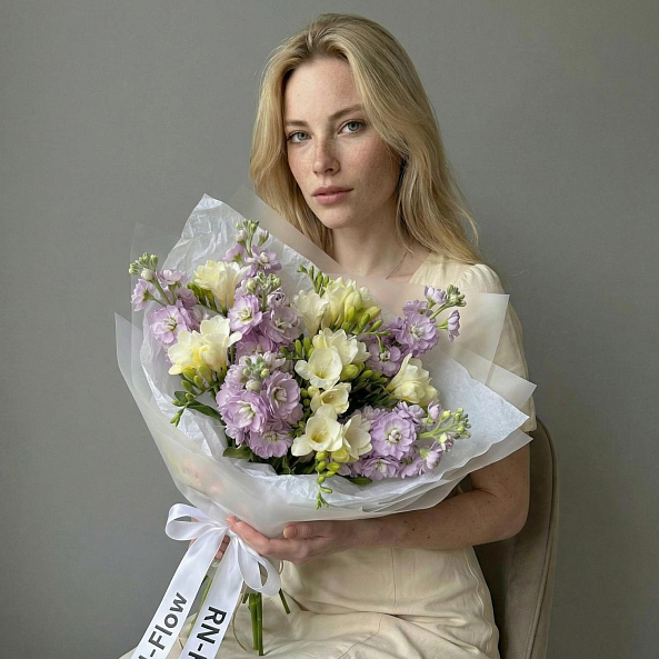 Погрузитесь в мир утонченной гармонии с этим очаровательным букетом, где нежные фиолетовые цветы в оттенке лаванды плавно сливаются с кремовыми акцентами, создавая атмосферу спокойствия и вдохновения. Каждый цветок, словно кисть художника, прописан в мягких пастельных тонах, а свежие зеленые стебли добавляют композиции естественности и легкости. Аккуратная упаковка в белую бумагу и лента с логотипом «RN-Flow» подчеркивают изысканность букета, превращая его в идеальный подарок для самых важных моментов.