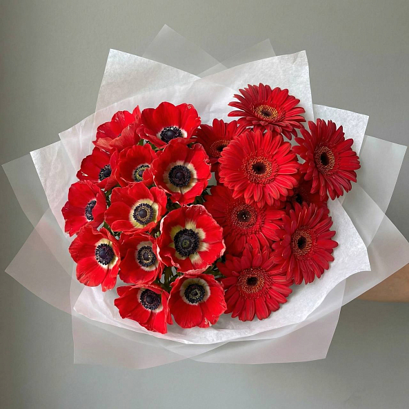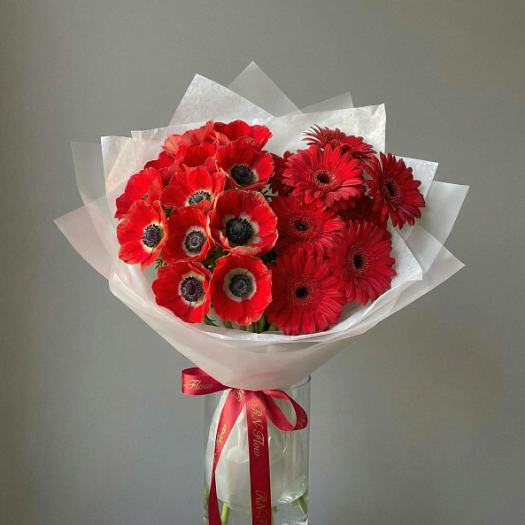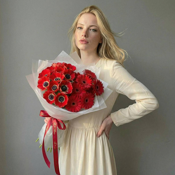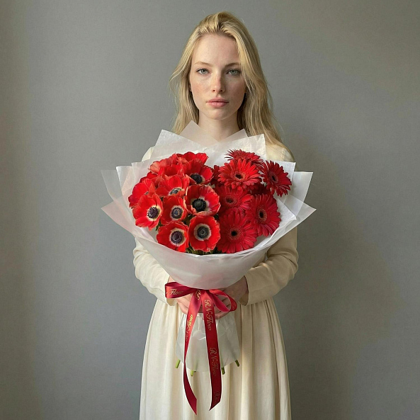 Букет «Красный бал» — это смелое и страстное выражение чувств в каждом лепестке. Яркие красные анемоны с глубокими темными центрами, словно живые искры, гармонично соседствуют с пышными герберами, дарящими объем и энергичность. Белая упаковка подчеркивает насыщенность цветов, а бордовая лента с надписью «RN-Flow» добавляет изысканности и завершённости. Этот букет — идеальный выбор для тех, кто хочет выразить глубокую любовь, признание в чувствах или просто подарить вдохновение. Подойдет для Дня святого Валентина, годовщины или как смелый жест, чтобы напомнить близкому человеку о вашей страсти и преданности. Каждый цветок здесь — не просто подарок, а искреннее послание, которое останется в памяти как яркий след эмоций.