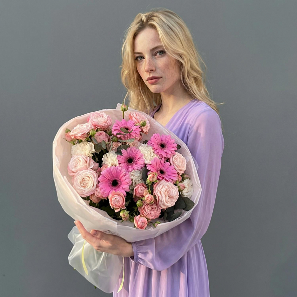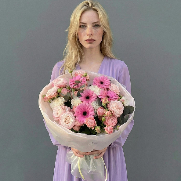 Этот букет — нежное переплетение чувств, где яркие розовые герберы, словно солнечные зайчики, соседствуют с пышными кустовыми розами в персиковом градиенте. Белые хризантемы добавляют воздушности, а зелень эвкалипта придает композиции свежесть и естественную гармонию. Каждый цветок, словно выписанный из весеннего сада, создает ощущение легкости и тепла, а аккуратная упаковка в прозрачную кальку с белой лентой подчеркивает изысканную простоту.