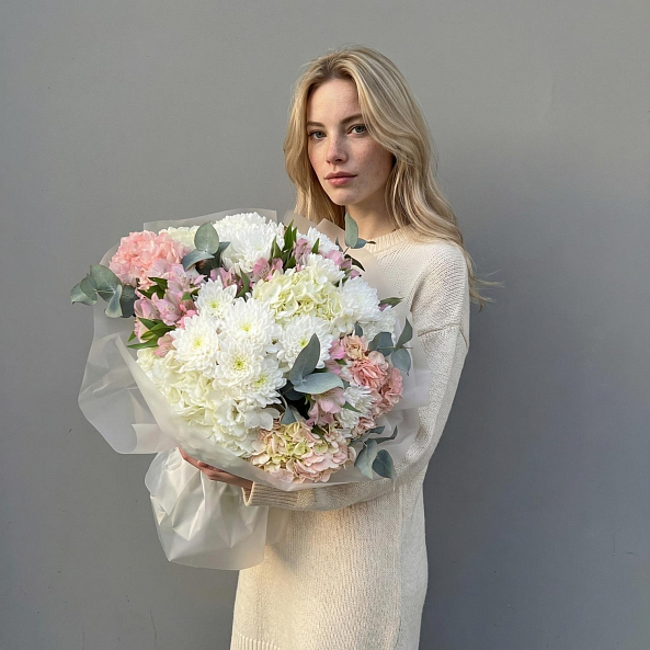 Белая гортензия, розовая альстромерия, пушистая хризантема «Атай» и свежий эвкалипт — это не просто букет, а целая история. Идеален для тех, кто хочет подарить не просто цветы, а целое настроение.