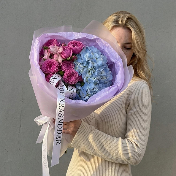 Голубая гортензия, розовая альстромерия и пушистые пионовидные розы «Мисти Баблс» — это не просто букет, а целая история. Идеален для тех, кто хочет подарить не просто цветы, а целое настроение.