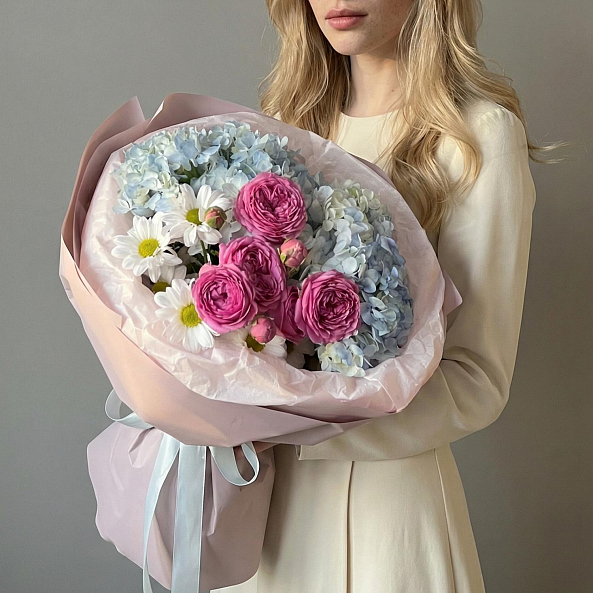 Букет «Цветочная мечта» — Гортензия + Пионовидная роза + Хризантема