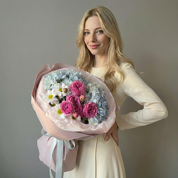 Гортензия, пионовидная роза и кустовая хризантема — это не просто букет, а целая история. Идеален для тех, кто хочет подарить не просто цветы, а целое настроение.