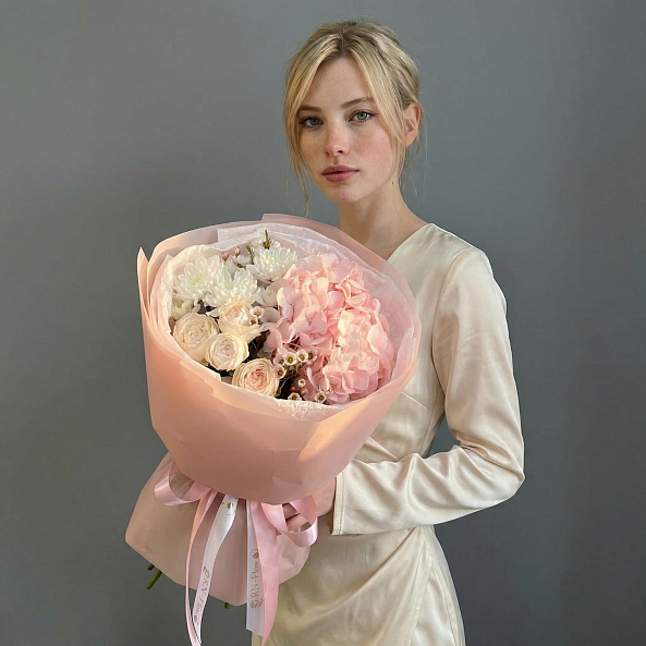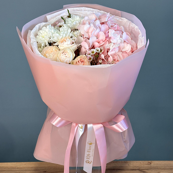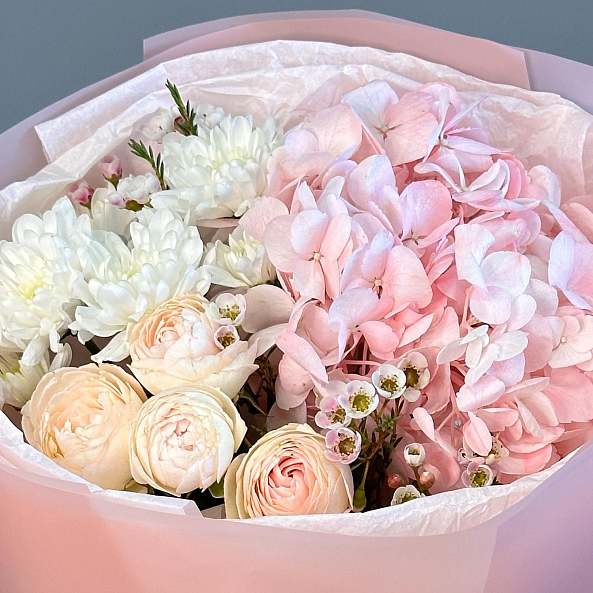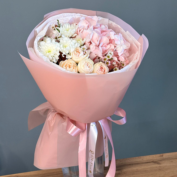 Этот изысканный букет — нежное переплетение розовой гортензии, кустовой хризантемы, пионовидных роз и хамелациума, словно застывший волшебный рассвет. Каждый цветок, от пышных соцветий гортензии до нежных бутонов хризантем, дарит ощущение тепла и уюта, а аккуратные ветки хамелациума придают композиции свежесть и естественную гармонию. Упакованный в прозрачную кальку с лентой «RN-Flow», букет выглядит лаконично и стильно, идеально дополняя как повседневный образ, так и особый момент.