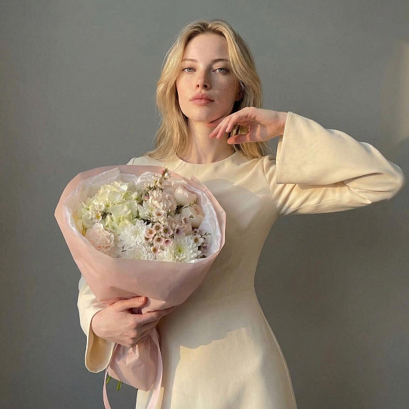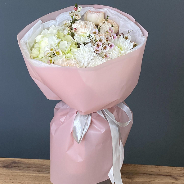 Этот изысканный букет — неплетение пионовидных роз, объемных гортензий, ароматной гвоздики, нежных хризантем и зелени хаммелациума, словно застывший волшебный рассвет в пастельных тонах. Каждый цветок, от пышных бутонов роз до воздушных соцветий гортензии, дарит ощущение тепла и уюта, а аккуратные ветки хаммелациума придают композиции свежесть и естественную гармонию. Упакованный в розовую кальку с атласной лентой «RN-Flow», букет выглядит лаконично и стильно, идеально дополняя как романтический образ, так и минималистичный интерьер.