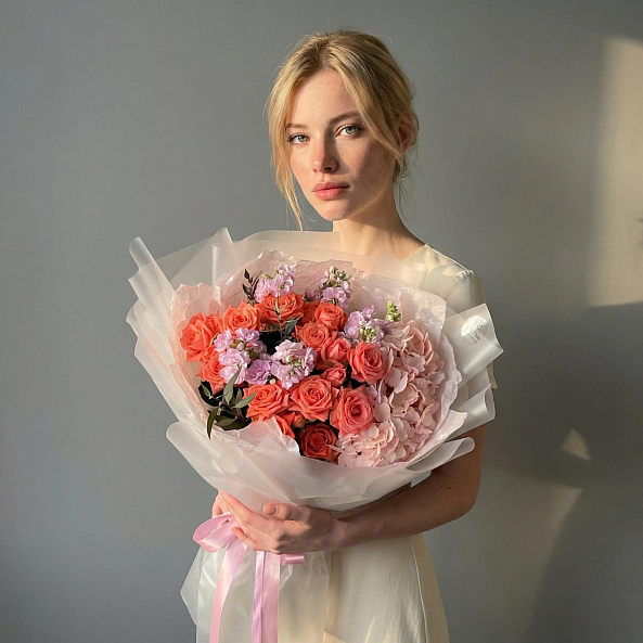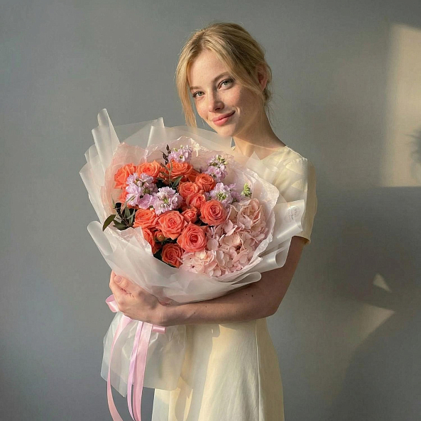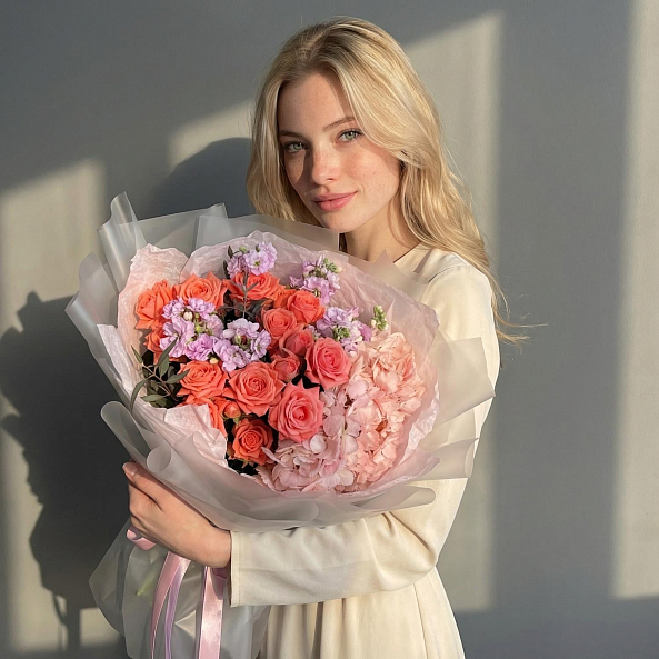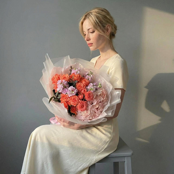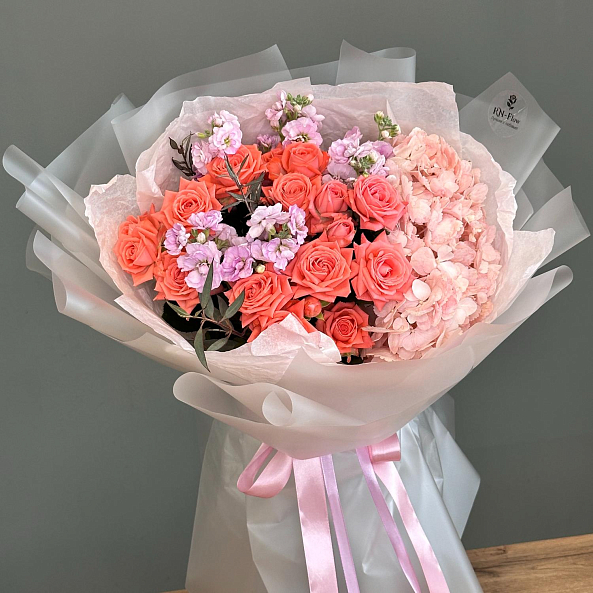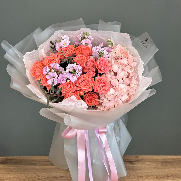 Этот изысканный букет — нежное переплетение кустовых пионовидных роз, объемных гортензий и ароматной маттиолы, словно застывший волшебный закат в коралловых и розовых тонах. Каждый бутон, от пышных лепестков роз до воздушных соцветий гортензии, дарит ощущение тепла и глубины, а аккуратные ветки маттиолы придают композиции свежесть и изысканности. Упакованный в прозрачную кальку с атласной лентой «RN-Flow», букет выглядит лаконично и стильно, идеально дополняя как свадебный образ, так и романтический вечер.
