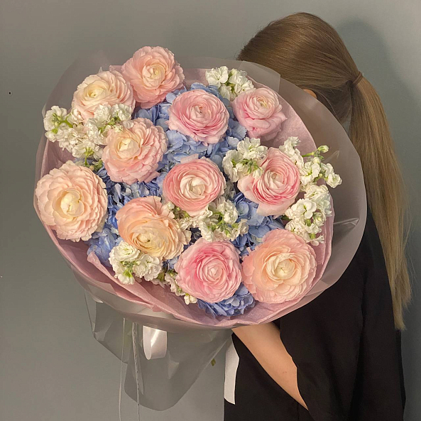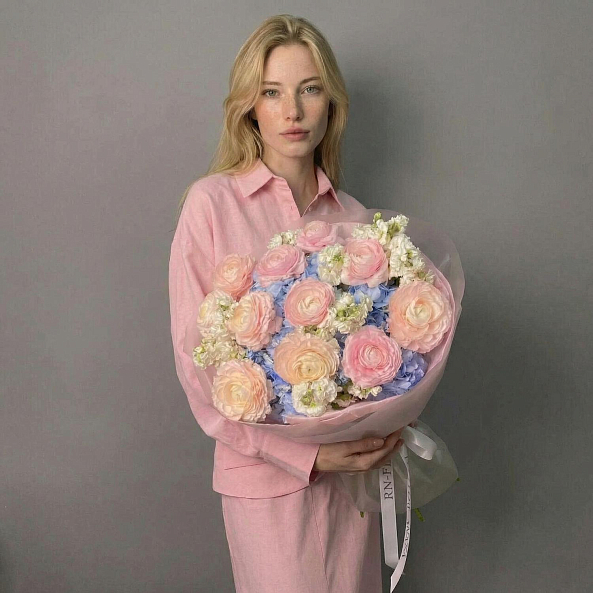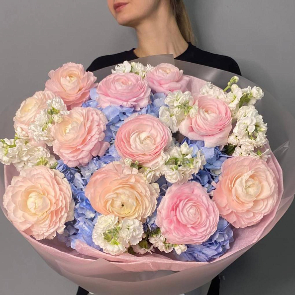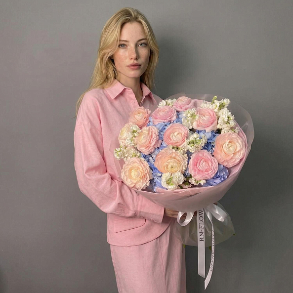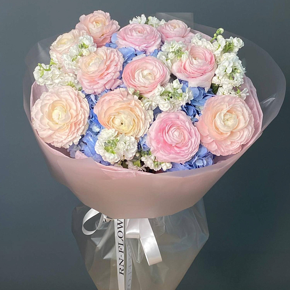 Этот изысканный букет — нежное переплетение текстур и оттенков, где объемные соцветия гортензии, пышные ранункулюсы и ароматная белая маттиола создают композицию, словно застывший весенний рассвет. Каждый элемент, от нежно-голубых гортензий до розовых ранункулюсов и кремовых веток маттиолы, дарит ощущение хрупкой красоты и утонченной романтики. Аккуратные листья эвкалипта придают букету естественную гармонию, а розовая упаковка в кальке с лентой «RN-Flow» подчеркивает его лаконичный и современный образ.