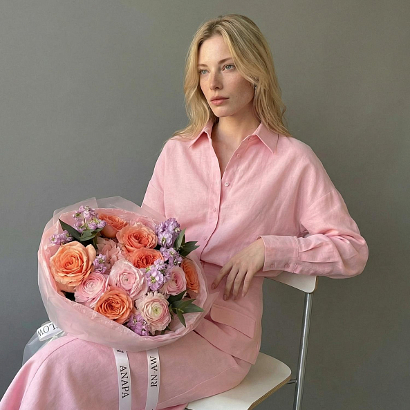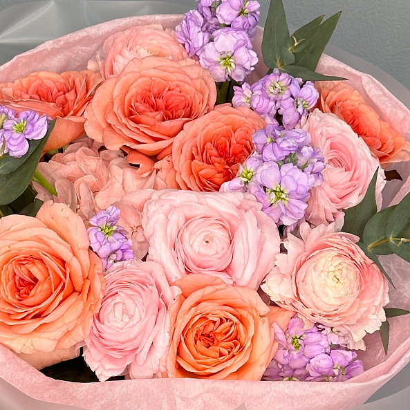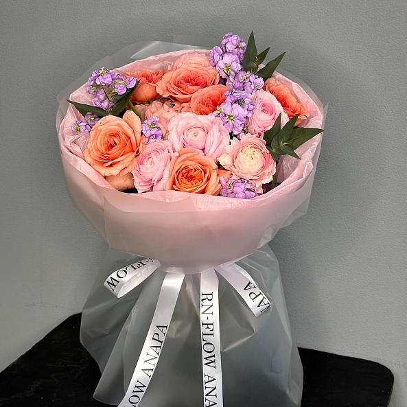 Этот изысканный букет — нежное переплетение теплых оттенков, где персиковые розы, словно застывший закат, гармонично сочетаются с пастельными розовыми и фиолетовыми акцентами. Каждый бутон, от пышных кустовых роз до мелких цветков гвоздики, дарит ощущение уюта и романтики, а аккуратные ветки эвкалипта придают композиции свежесть и естественную гармонию. Упакованный в нежную розовую кальку с лентой «RN-Flow», букет выглядит лаконично и современно, идеально дополняя как повседневный образ, так и особый момент.
