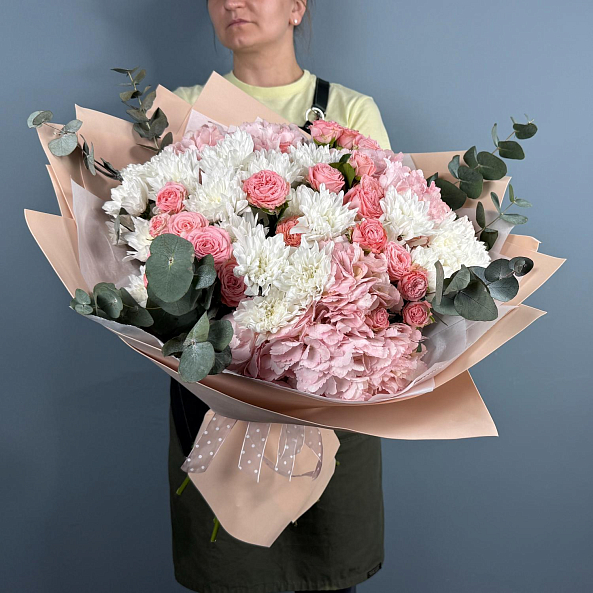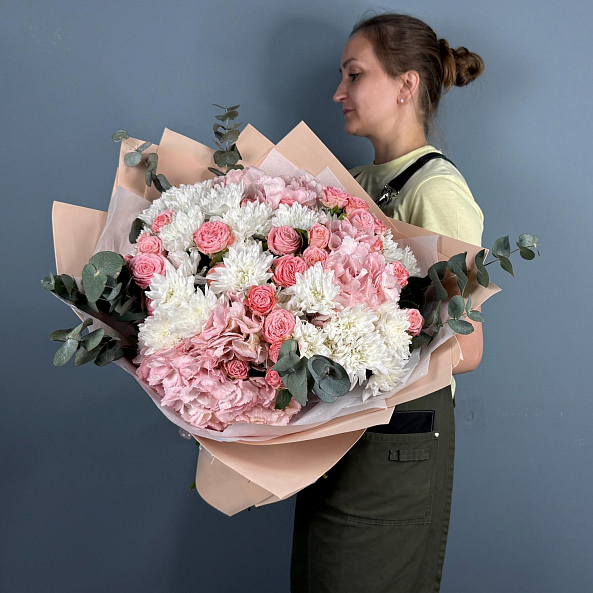 Букет цветов. Гортензия Розовая, Кустовая Пионовидная Роза "Мадам Бомбастик", Хризантема Кустовая "Алтай".