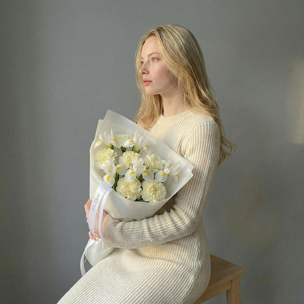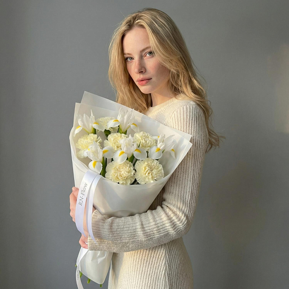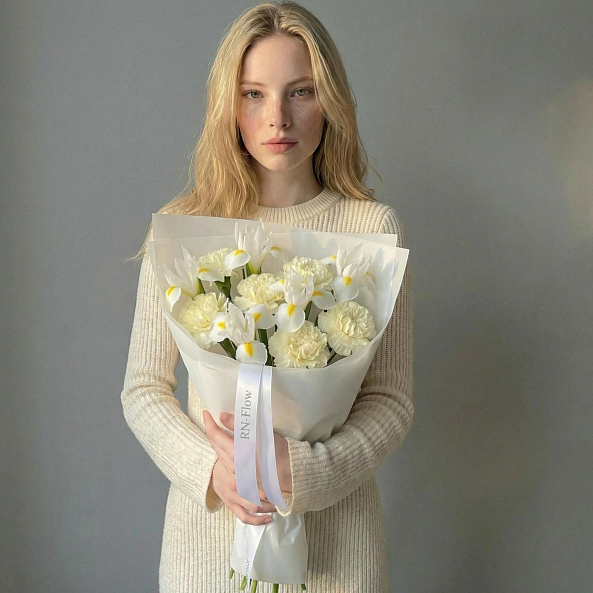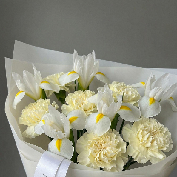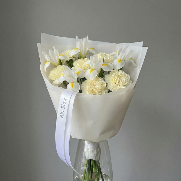 Погрузитесь в атмосферу утонченной простоты с этим изысканным букетом, где белые ирисы с нежными желтыми центрами и пышные гвоздики сливаются в единый поцелуй света. Каждый лепесток, словно укутанный утренним туманом, излучает чистоту и гармонию, а аккуратная упаковка в белую бумагу с лентой «RN-Flow» подчеркивает минималистичную элегантность композиции.