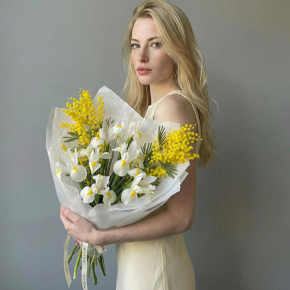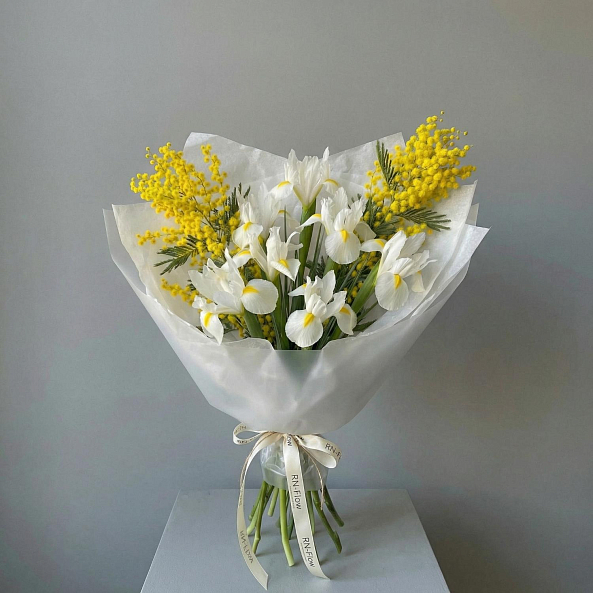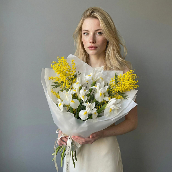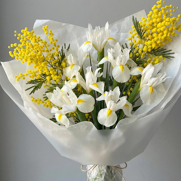 Погрузитесь в нежное обаяние весны с этим изысканным букетом из белых ирисов с яркими желтыми центрами и золотистой мимозы. Каждый ирис, словно озаренный утренним солнцем, символизирует надежду и мудрость, а пушистые веточки мимозы добавляют композиции нежность и изысканную легкость. Вместе они создают гармонию, напоминающую первый весенний день — свежий, светлый и полный обещаний.