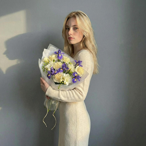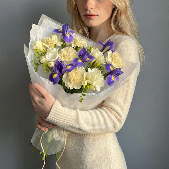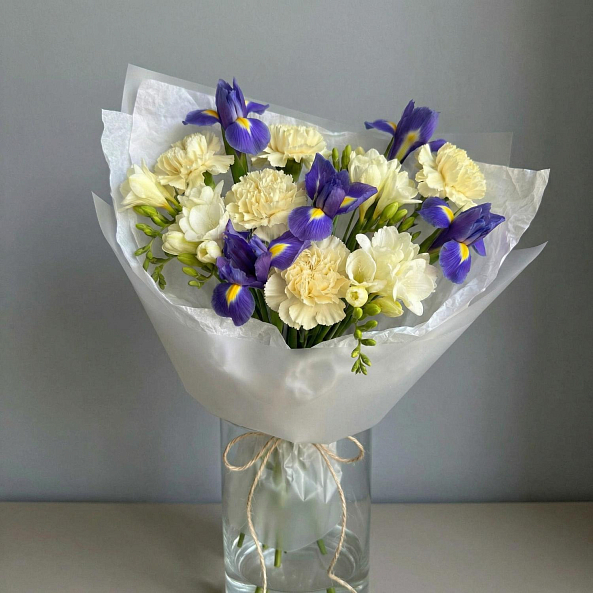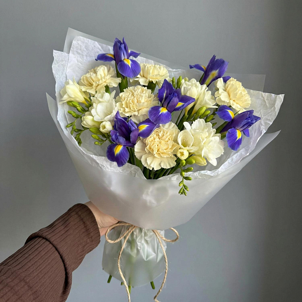 Погрузитесь в мир изысканной элегантности с этим уникальным букетом, где фиолетовые ирисы с золотистыми акцентами в центре соседствуют с пышными кремовыми гвоздиками и нежными желтыми бутонами. Каждый цветок, словно кисть художника, создает гармоничный контраст, превращая композицию в живое произведение искусства. Аккуратная упаковка в белую бумагу и естественная веревка подчеркивают аутентичность и утонченность букета.