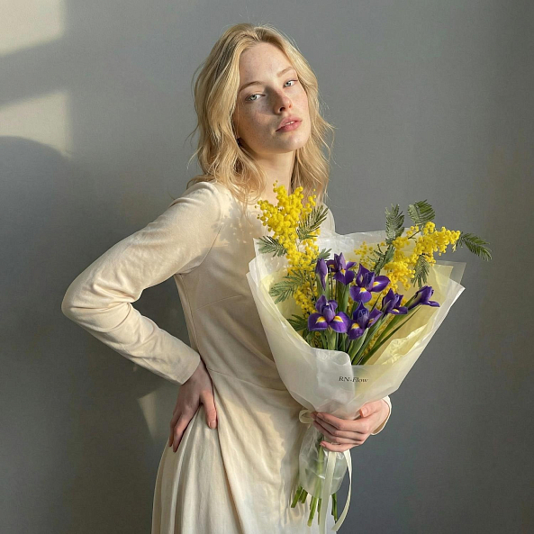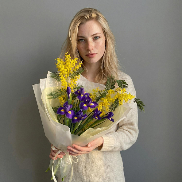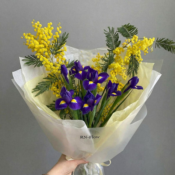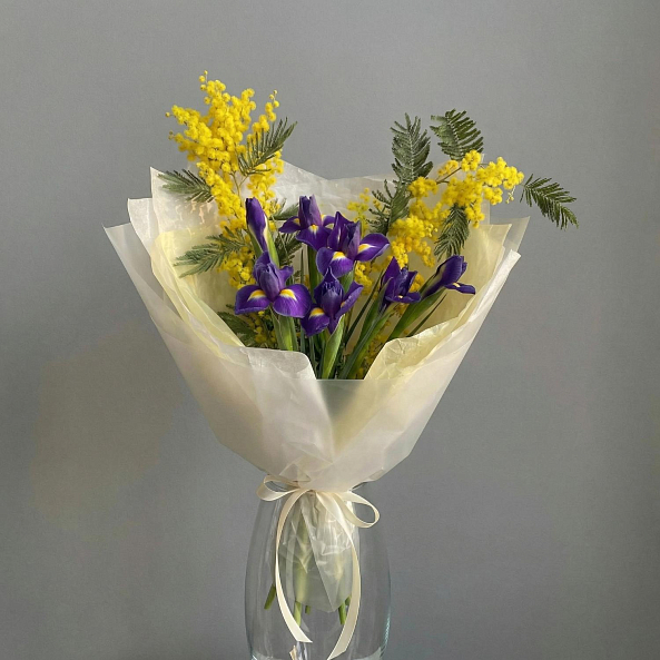 Погрузитесь в мир вдохновляющей гармонии с этим уникальным букетом, где нежные желтые мимозы — символ весны и нежности — сливаются с глубокими фиолетовыми ирисами, олицетворяющими мудрость и надежду. Каждый цветок, словно нота в симфонии, создает изысканный контраст: легкие кисти мимозы, словно солнечные зайчики, обрамляют пышные ирисы с золотистыми акцентами в центре, превращая композицию в живое произведение искусства.