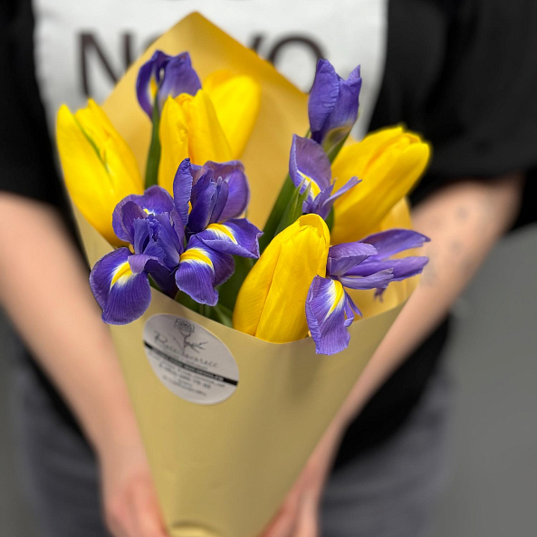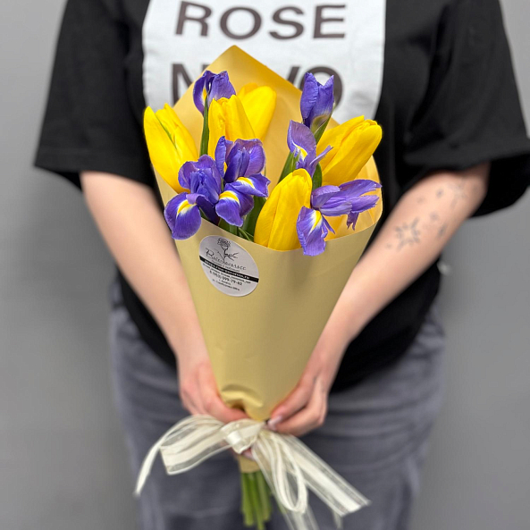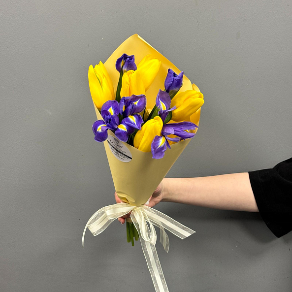 Букет «Солнечный аккорд: Фиолетовый ирис и Желтый тюльпан»