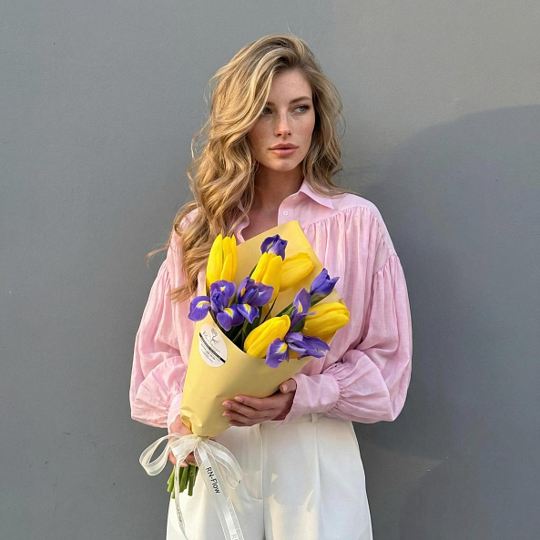 Этот изысканный букет — нежное переплетение фиолетовых ирисов с их изысканными лепестками и ярких желтых тюльпанов, словно застывший волшебный рассвет, где небо сливается с солнечным светом. Каждый элемент, от изогнутых лепестков ирисов до пышных бутонов тюльпанов, дарит ощущение тепла и энергии, а аккуратные ветки эвкалипта придают композиции естественную гармонию. Упакованный в желтую кальку с атласной лентой «RN-Flow», букет выглядит лаконично и стильно, идеально дополняя как повседневный образ, так и особый момент.