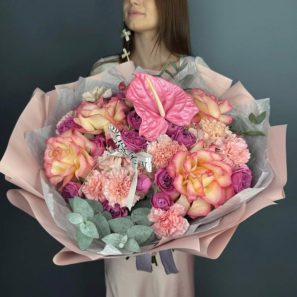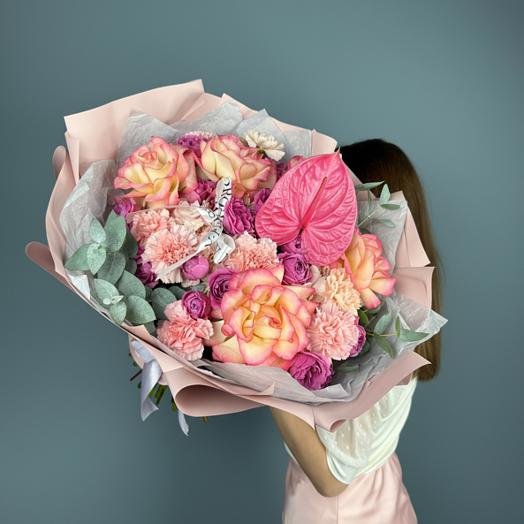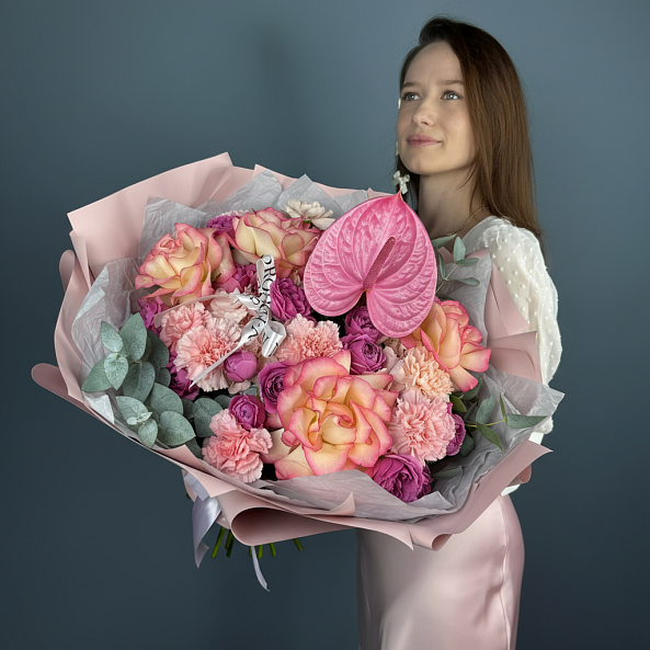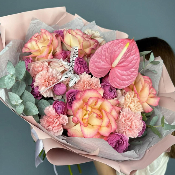 Роскошный и нежный букет в пастельных тонах: крупные розы с персиковым отливом, пышные фиолетовые и розовые гвоздики, яркий акцент — розовый антуриум. Дополняют композицию свежий эвкалипт и воздушная упаковка в розовых оттенках. Идеален для романтического подарка или как знак внимания — изысканно, женственно и запоминающе. Идеальный Букет на День Мамы.