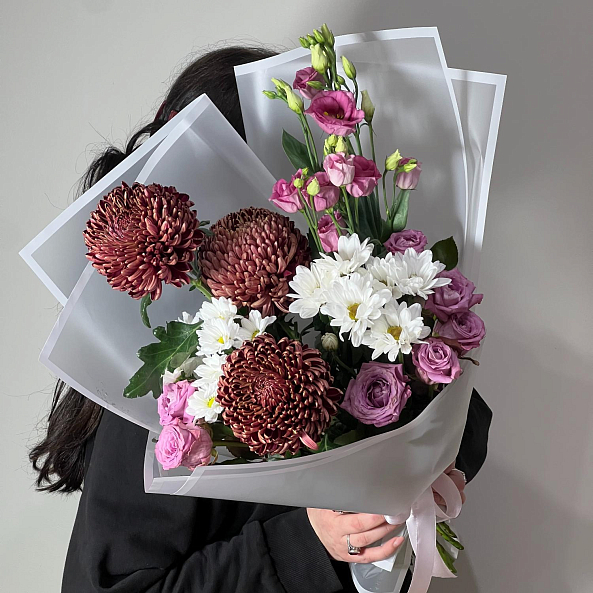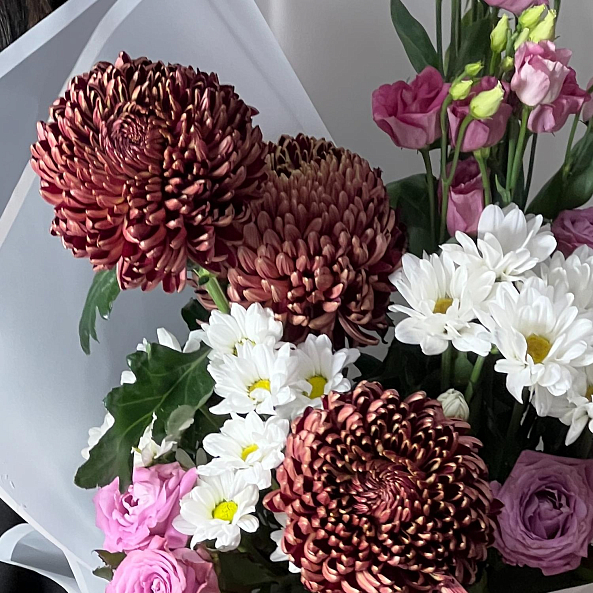 Элегантный и насыщенный букет в глубоких, но нежных тонах. Сочетает пышные коричневые хризантемы «Бигуди», изящную розовую эустому, белые кустовые хризантемы и роскошные фиолетово-розовые розы «Найтингейл». Композиция создает контраст текстур и оттенков — от плотных шаров хризантем до нежных лепестков роз и эустомы. Упакован в простую белую бумагу, что подчеркивает природную красоту цветов. Идеален для тех, кто ценит утонченность и необычную цветовую гамму.