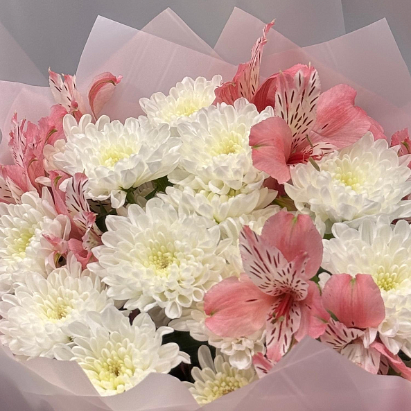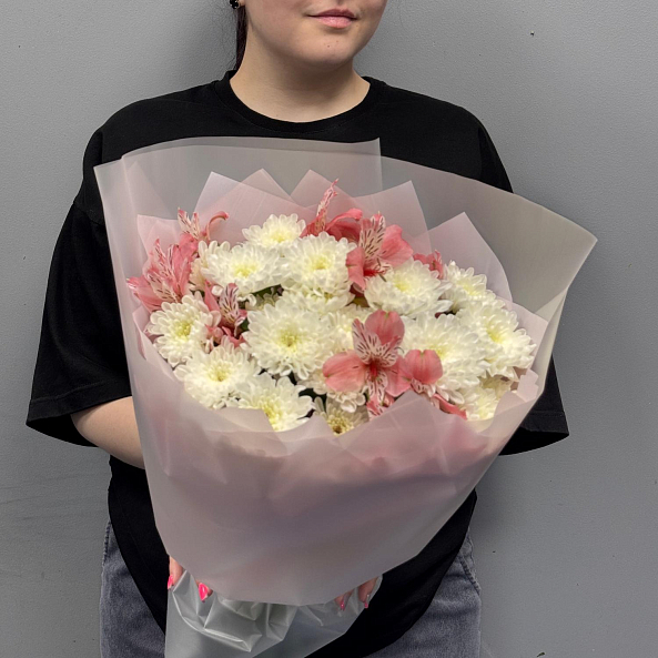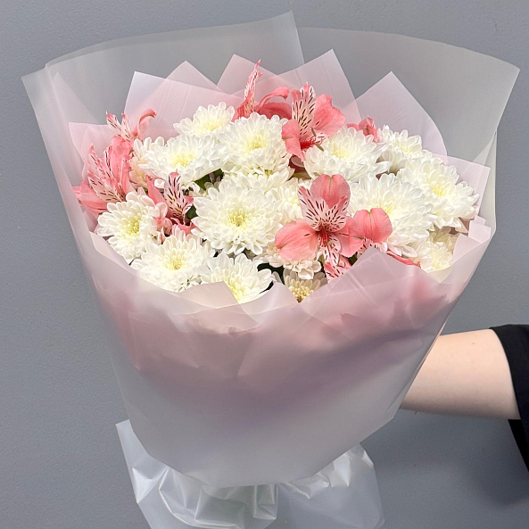 Лёгкий и воздушный букет из розовой альстромерии и кустовой хризантемы сорта "Алтай". Натуральный, свежий и изысканный — идеален для подарка на день рождения, другое торжество или как романтический жест.