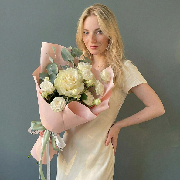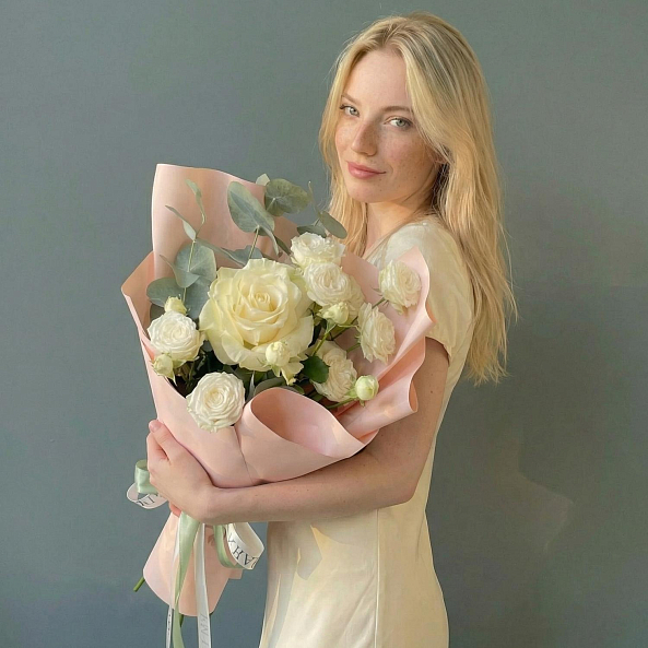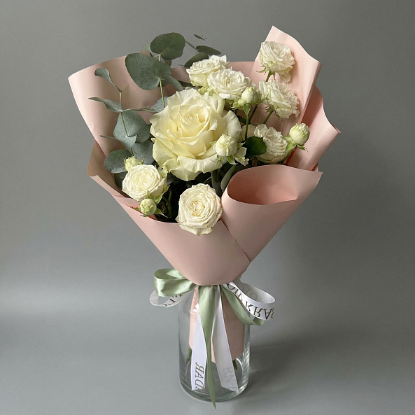 Букет цветов. Кустовая Белая Пионовидная Роза "Вайт Пиони", Роза Эквадор "Мондиаль", Эвкалипт.