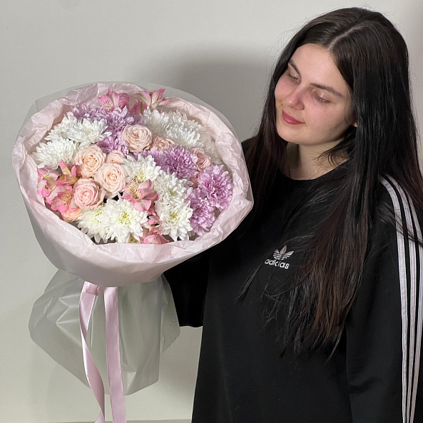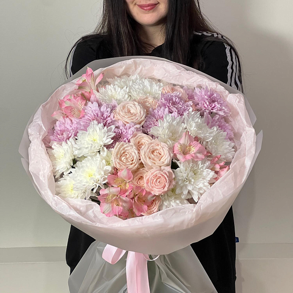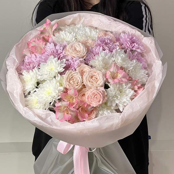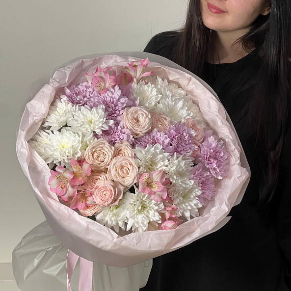 Нежный и пышный букет в пастельных тонах, созданный для тех, кто ценит утонченность и романтику. В композиции — объемные пионовидные розы «Мисс Пиони» с нежно-розовым оттенком, изящная альстромерия, кустовые хризантемы «Чик» и «Калимба», добавляющие текстуры и свежести. Цветы собраны в объемную, воздушную форму, упакованную в мягкую бумагу с лентой. Идеальный выбор для любого повода — от дня рождения до просто «потому что ты особенная».