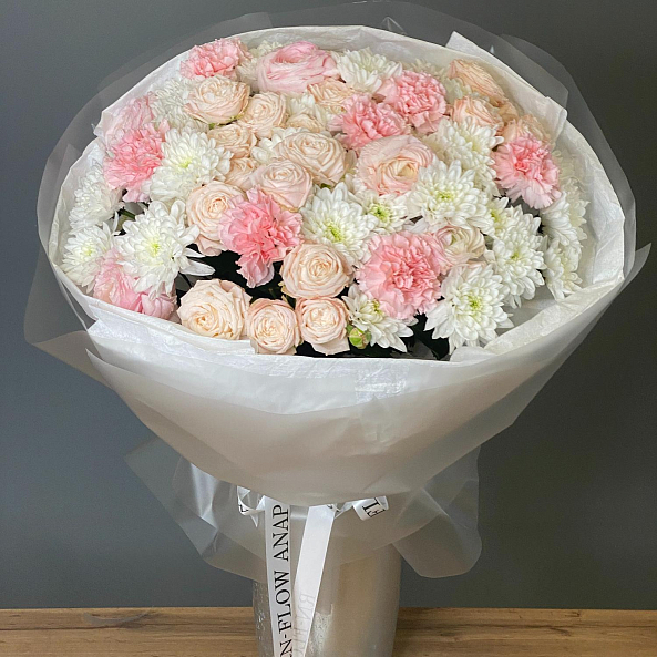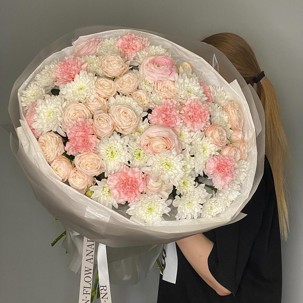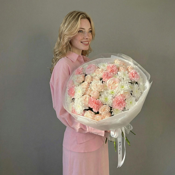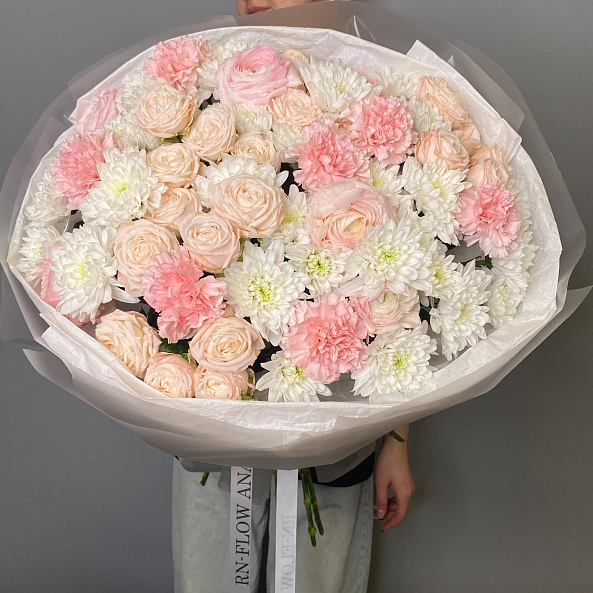 Этот изысканный букет — нежное переплетение нежно-розовых роз, объемных белых хризантем и пышных гвоздик, словно застывший волшебный рассвет. Каждый цветок, от пышных роз до воздушных хризантем, дарит ощущение тепла и уюта, а аккуратные ветки эвкалипта придают композиции свежесть и естественную гармонию. Упакованный в прозрачную кальку с лентой «RN-Flow», букет выглядит лаконично и стильно, идеально дополняя как повседневный образ, так и особый момент.