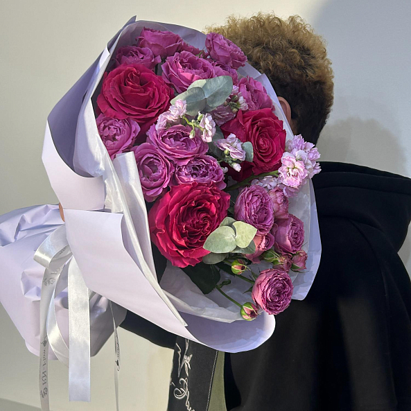 Букет Цветов. Кустовая Пионовидная Роза "Мисти Баблс", Роза Эквадор "Фулл Монти", Маттиола.