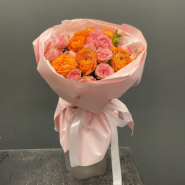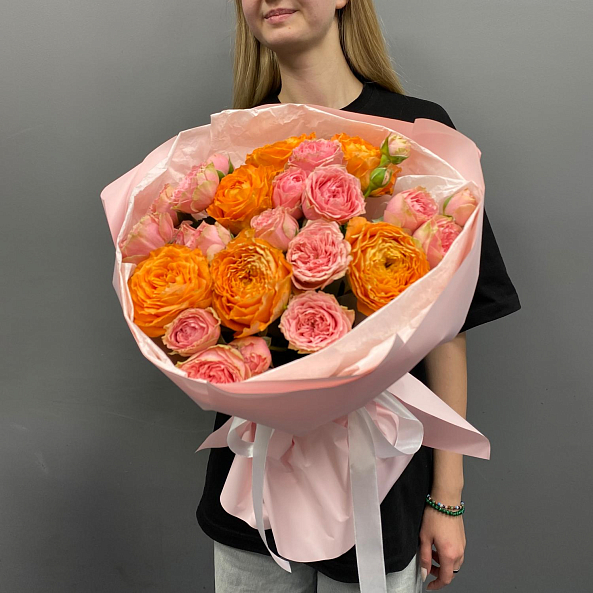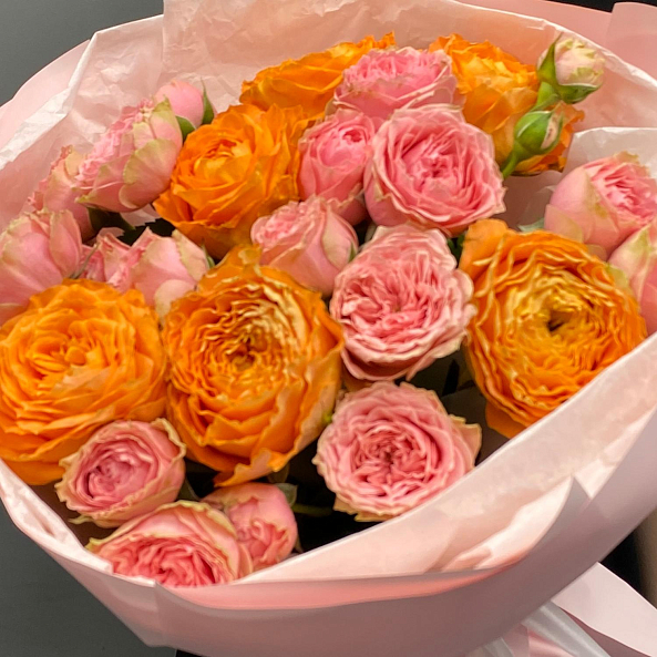 Яркий и жизнерадостный букет из розовых пионовидных  кустовых роз и оранжевых пионовидных роз. Сочное сочетание цветов в нежной розовой упаковке — идеальный выбор, чтобы подарить бодрость, тепло и хорошее настроение.