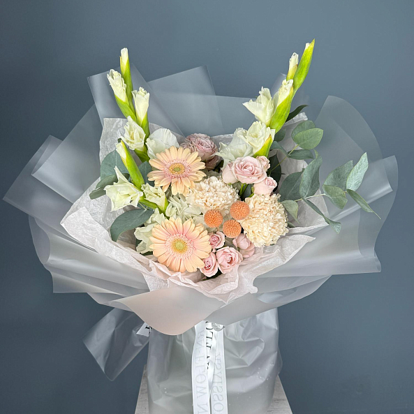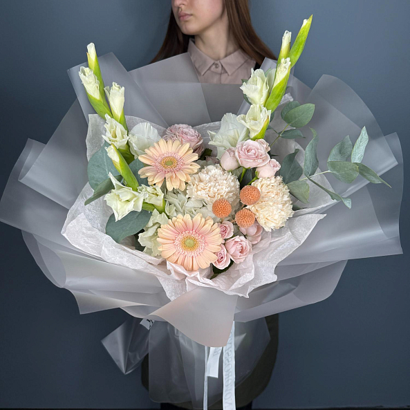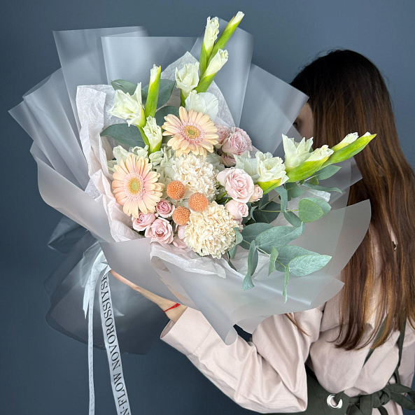 Элегантный и многослойный букет в нежной пастельной гамме. Композиция объединяет кустовую розу «Полина» с ее нежно-розовым оттенком, пышную белую гортензию, изящные белые гладиолусы, ароматную гвоздику, яркую герберу, текстурный сухоцвет «Краспедия» и свежие веточки эвкалипта цинерии. Все элементы собраны в объемную, воздушную форму, передающую ощущение уюта, спокойствия и утонченности. Упакован в матовую бумагу — идеальный выбор для тех, кто ценит безупречный вкус и гармонию.