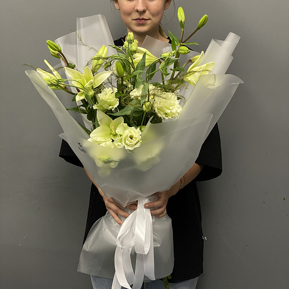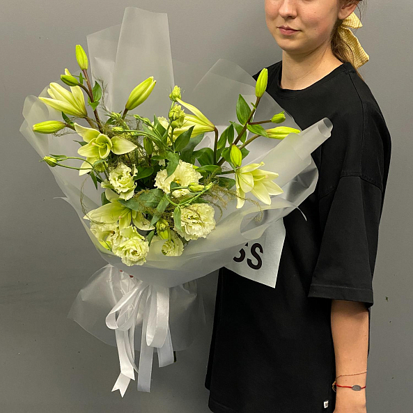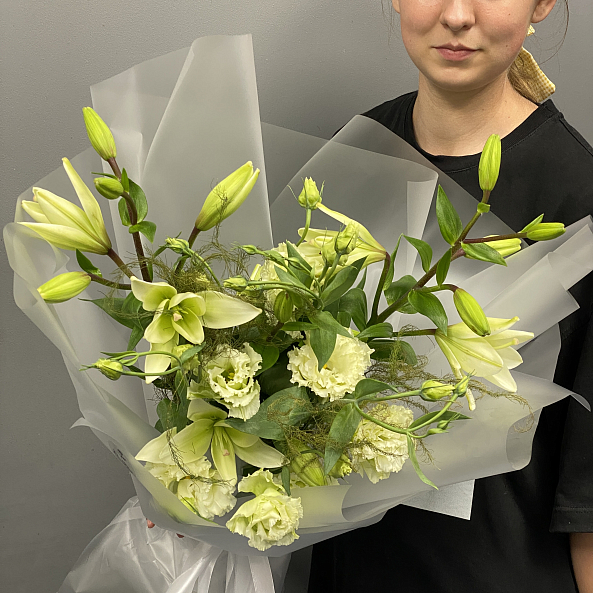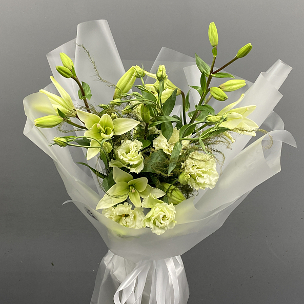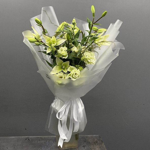 Букет Цветов. Лилия Белая, Эустома Махровая Зеленая, Зелень.