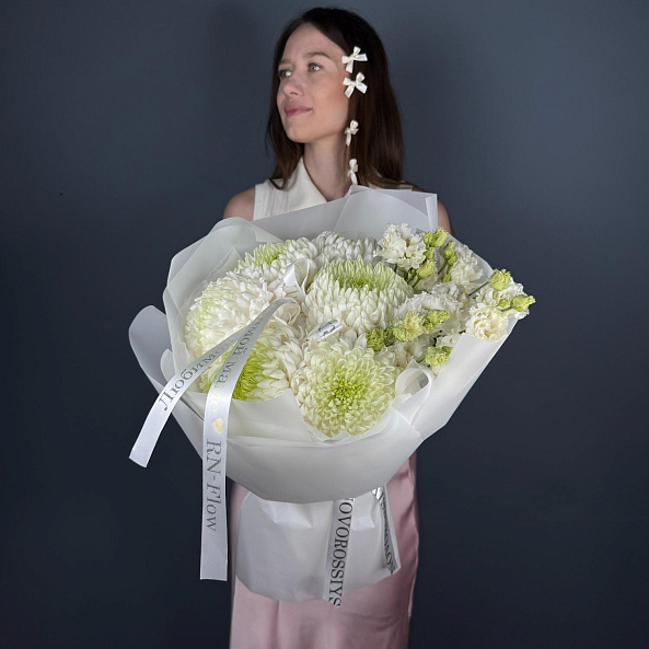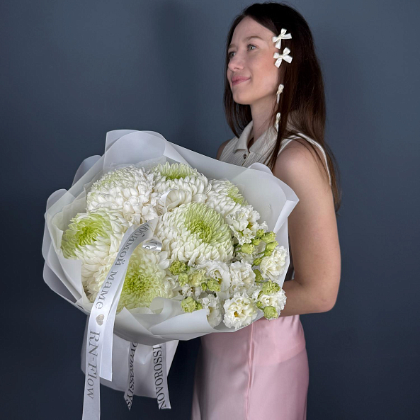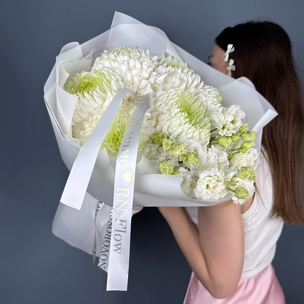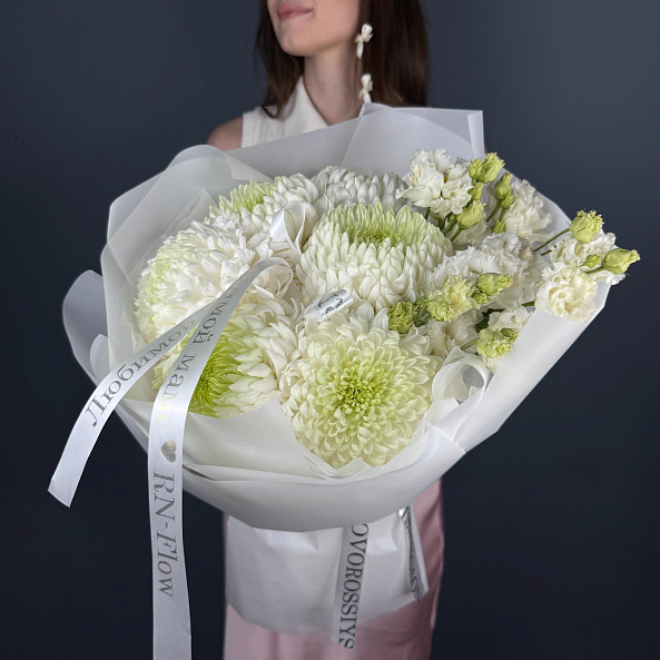 Букет цветов. «Любовь, которая не требует слов». Хризантема, Эустома.
