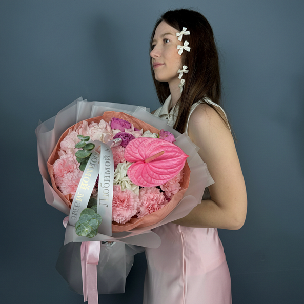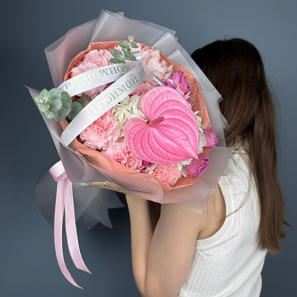 Букет цветов. "Мамина Любовь". Гортензия, Антуриум, Пионовидная кустовая Роза, Гортензия, Гвоздика (Диантус).