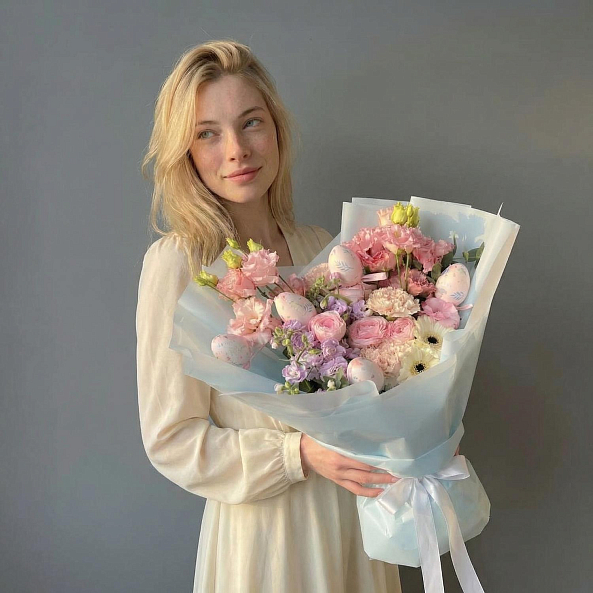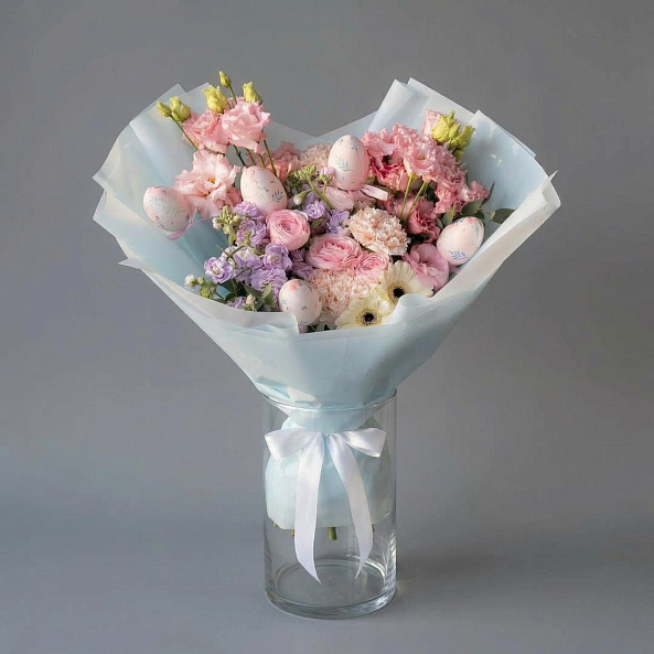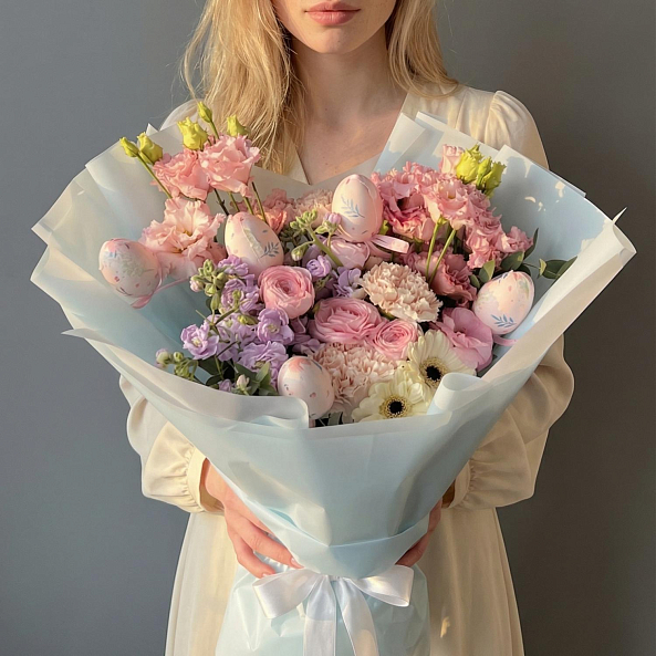 Этот очаровательный букет — настоящая симфония весеннего пробуждения, где пастельные оттенки и пасхальные символы сливаются в единый волшебный образ. В композиции переплетаются нежные розы, ароматные гвоздики, объемные гортензии и декоративные пасхальные яйца с цветочными узорами, словно застывший момент из детской сказки. Упакованный в светло-голубую кальку с белой лентой, букет выглядит лаконично и стильно, идеально дополняя как праздничный образ, так и интерьер.