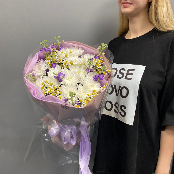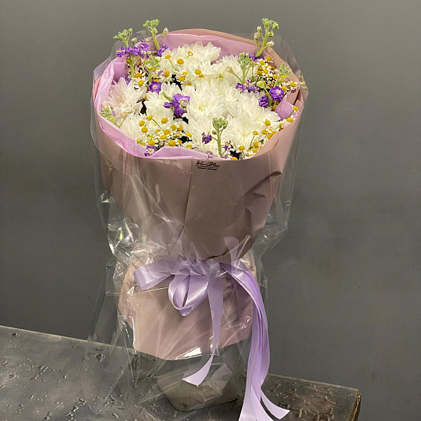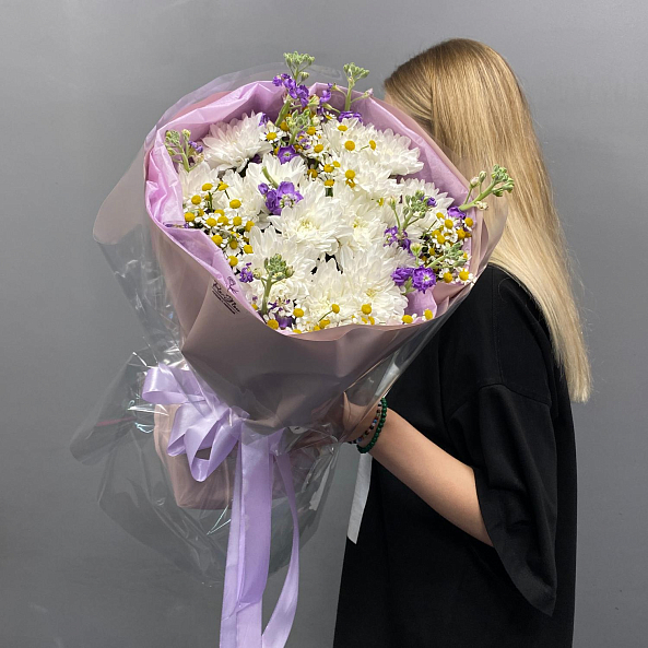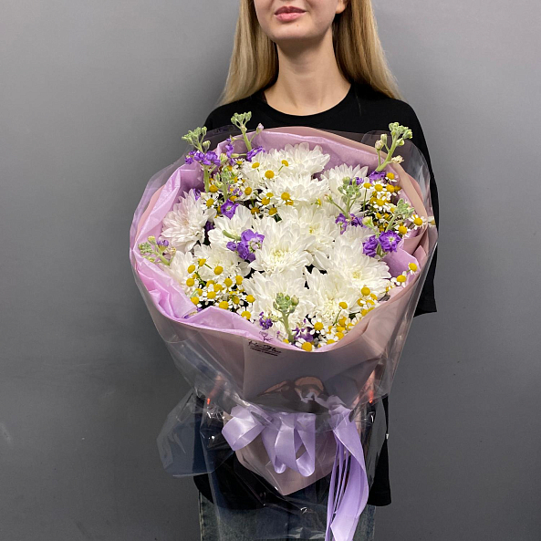 Лёгкий и нежный букет в природной стилистике. Лавандовая маттиола добавляет глубину цвета и тонкий аромат, белые хризантемы "Алтай" создают пышность и свежесть, а ромашки придают воздушность и уют.