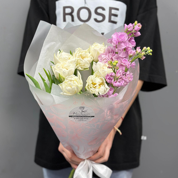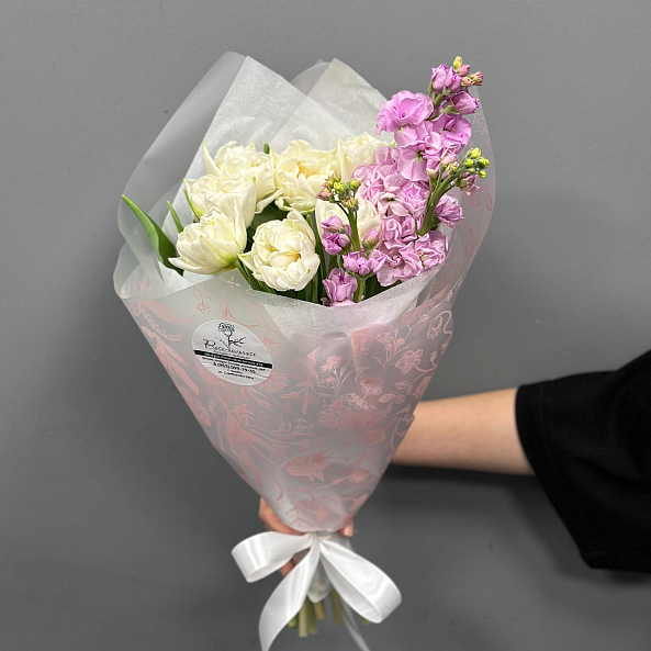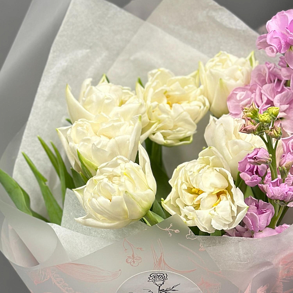Букет «Весенний дуэт: Маттиола и Пионовидные Тюльпаны»