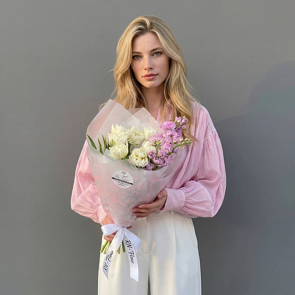 Этот изысканный букет — нежное переплетение нежно-лиловой маттиолы и объемных белых пионовидных тюльпанов, словно застывший волшебный закат в цветущем саду. Каждый элемент, от мелких ароматных соцветий маттиолы до пышных бутонов тюльпанов, дарит ощущение тепла и уюта, а аккуратные ветки эвкалипта придают композиции естественную гармонию. Упакованный в прозрачную кальку с атласной лентой «RN-Flow», букет выглядит лаконично и стильно, идеально дополняя как повседневный образ, так и особый момент.