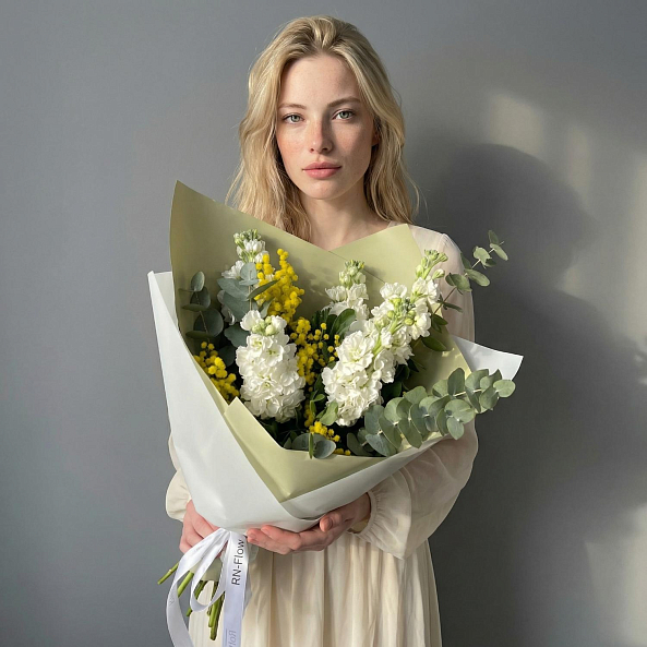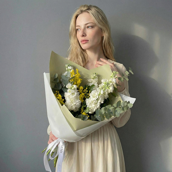 Букет цветов. Мимоза, Маттиола Белая, Эвкалипт.