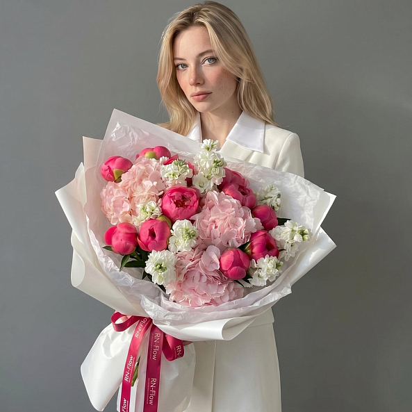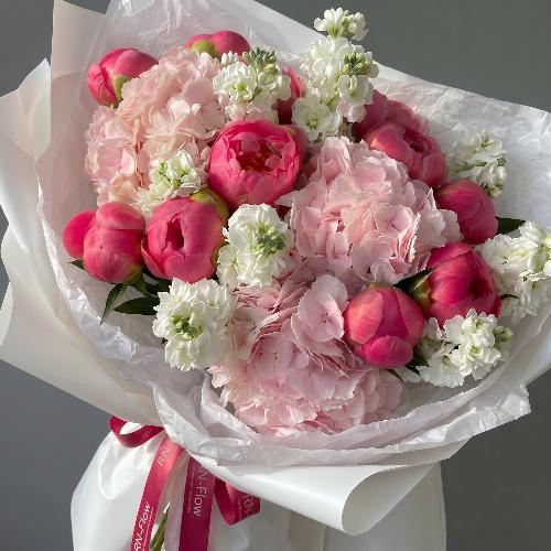 Букет «Цветочная Симфония: Пионы «Корал Сансет», Гортензия и Маттиола»