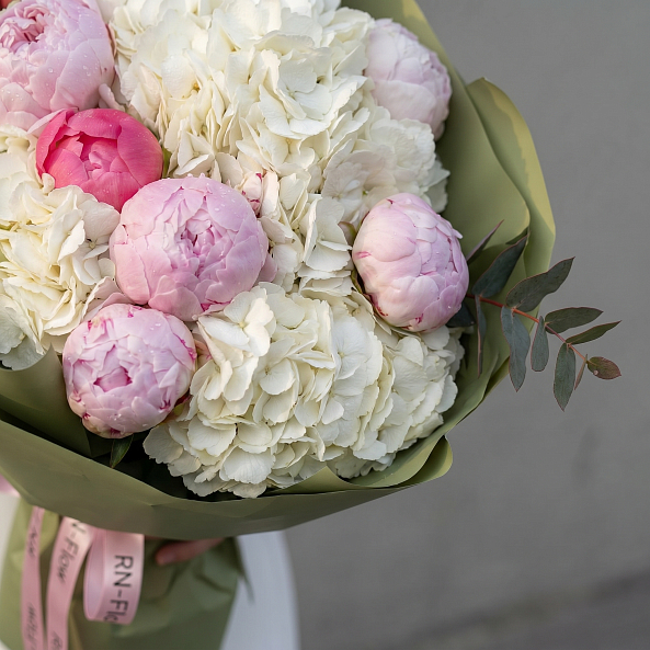 Букет цветов. Пион "Сара Бернар", "Корал Сансет", Гортензия, Эвкалипт.