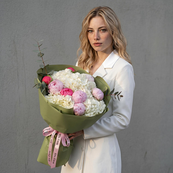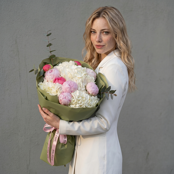 Этот изысканный букет — настоящая симфония пышности и нежности, где пионы «Сара Бернар» в нежно-розовом оттенке сливаются с «Корал Сансет» в теплом коралловом цвете, гортензией и эвкалиптом, создавая объемную, ароматную композицию, словно застывший момент из самого романтического уголка весеннего сада. Каждый цветок, от бархатистых лепестков пионов до изящных соцветий гортензии, дарит ощущение глубины чувств и утонченности, а аромат эвкалипта добавляет композиции свежести и природной гармонии