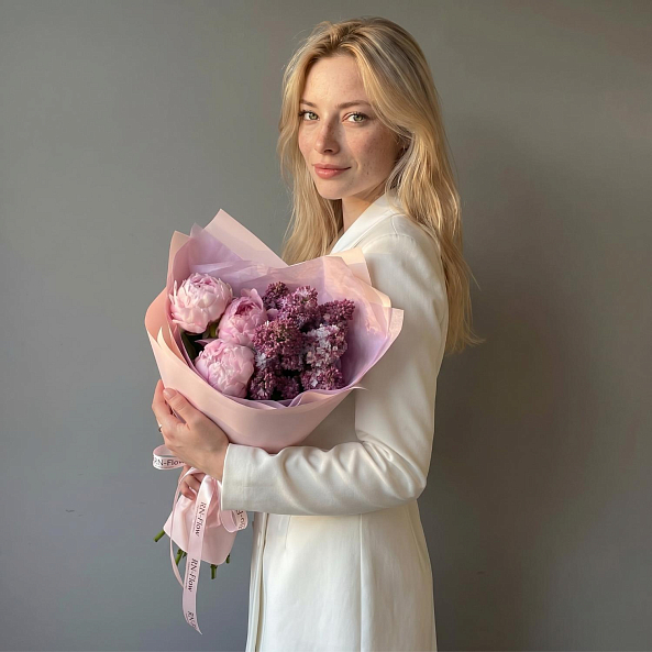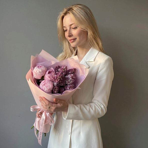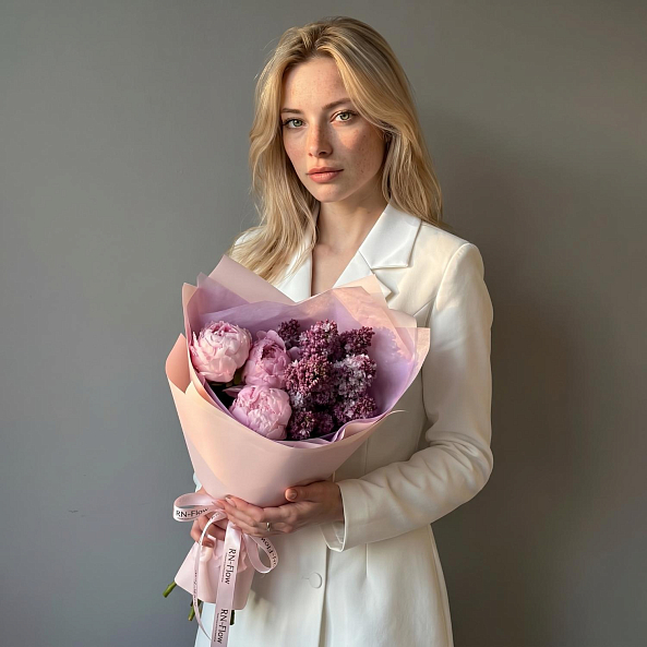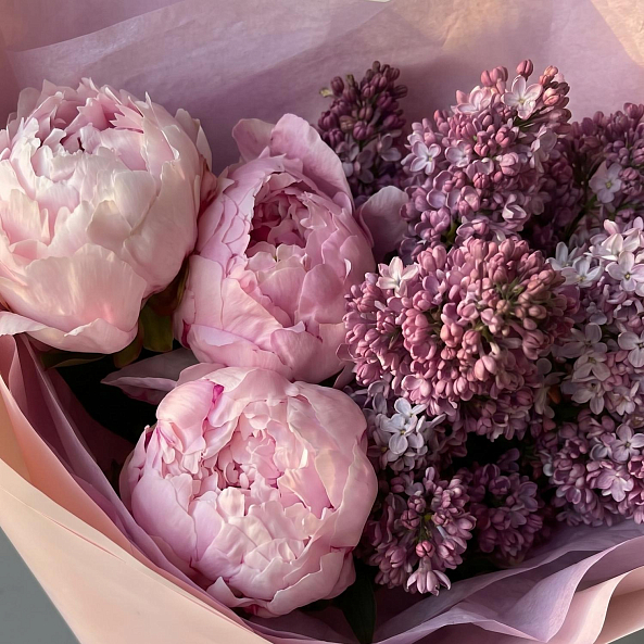 Этот изысканный букет — настоящая симфония нежности и благородства, где пионы «Сара Бернар» в нежно-розовом оттенке сливаются с сиренью в лавандовом оттенке, создавая объемную, ароматную композицию, словно застывший момент из самого романтического уголка весеннего сада. Каждый бутон, от пышных лепестков пионов до изящных соцветий сирени, дарит ощущение тепла и глубины чувств, а нежный аромат, напоминающий о весенних закатах, добавляет композиции волшебства.