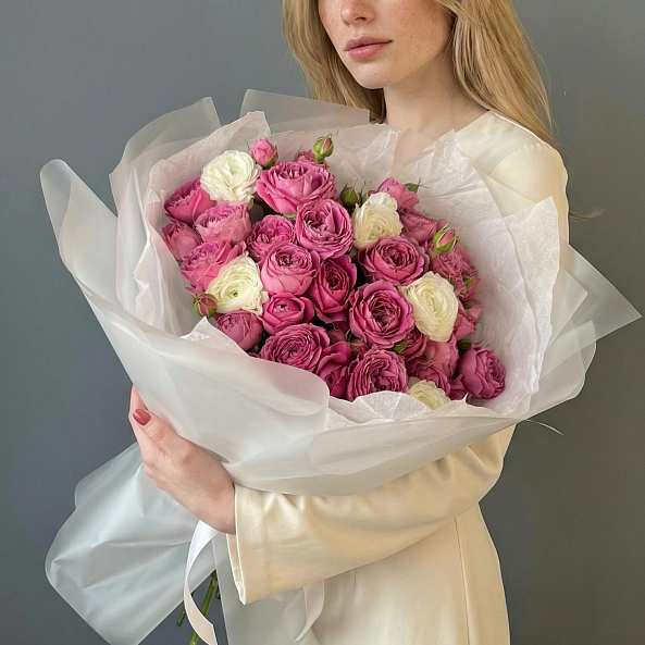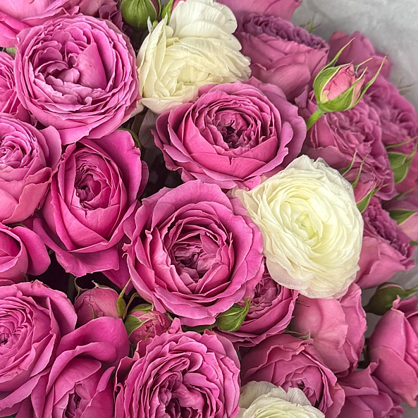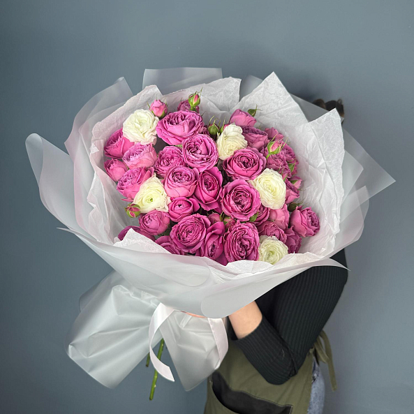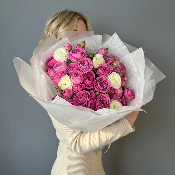 Этот букет — воплощение нежности и изысканности. В нем собраны пышные пионовидные розы «Мисти Баблс» с насыщенным малиново-розовым оттенком и многослойной чашей, напоминающей пион. Их дополняют белые ранункулюсы — они придают композиции воздушность, легкость и романтическое очарование. Контраст глубокого розового и чистого белого создает гармоничный, но выразительный образ, который невозможно не заметить.