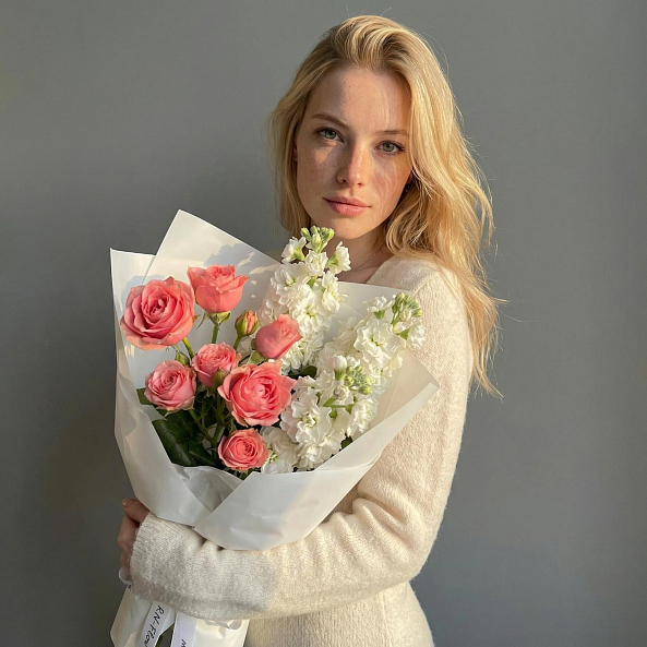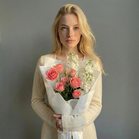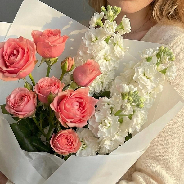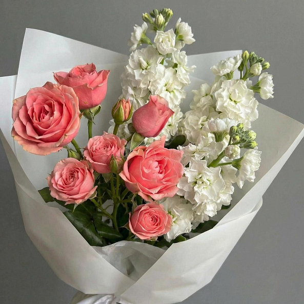 Погрузитесь в мир нежности с этим очаровательным букетом, где пышные розовые розы в оттенке нежного персика сливаются с чистыми белыми стоками, создавая атмосферу утонченной гармонии. Каждый лепесток, словно дыхание весны, передает тепло и нежность, а свежая зелень листьев придает композиции живость и свежесть. Букет, упакованный в элегантную белую бумагу и украшенный лентой с логотипом «RN-Flow», становится не просто подарком, а живым символом искренних чувств.