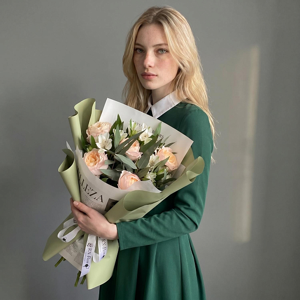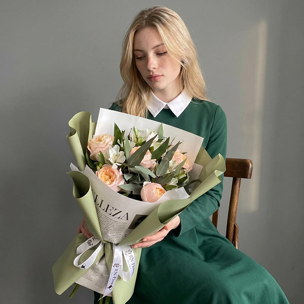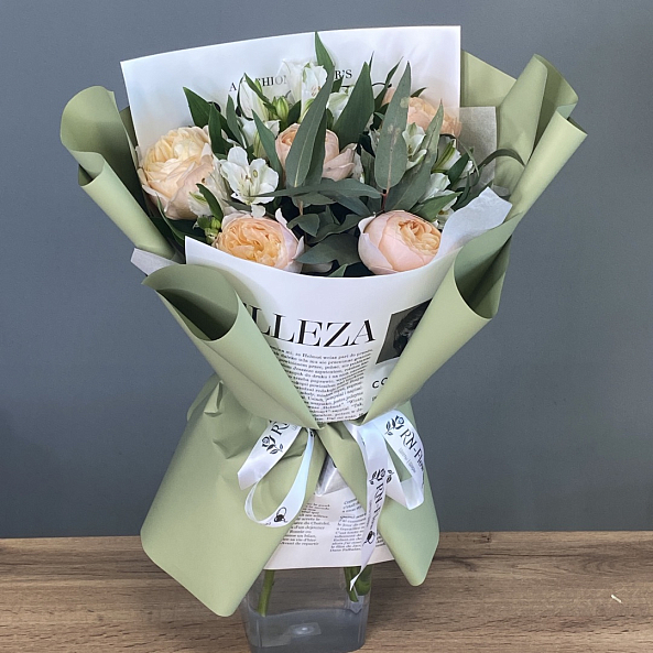 Букет цветов. Пионовидная Роза "Джульета", Альстромерия Белая.