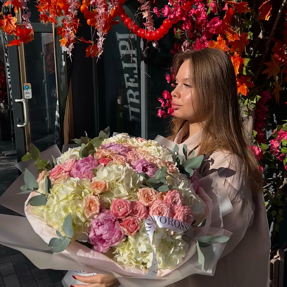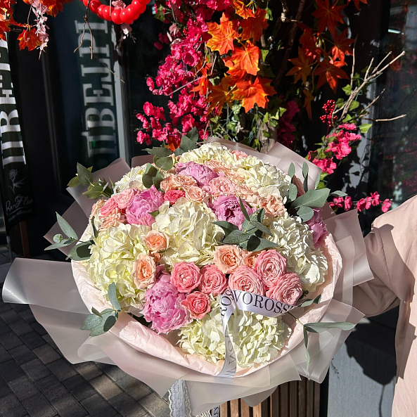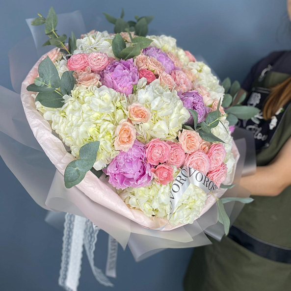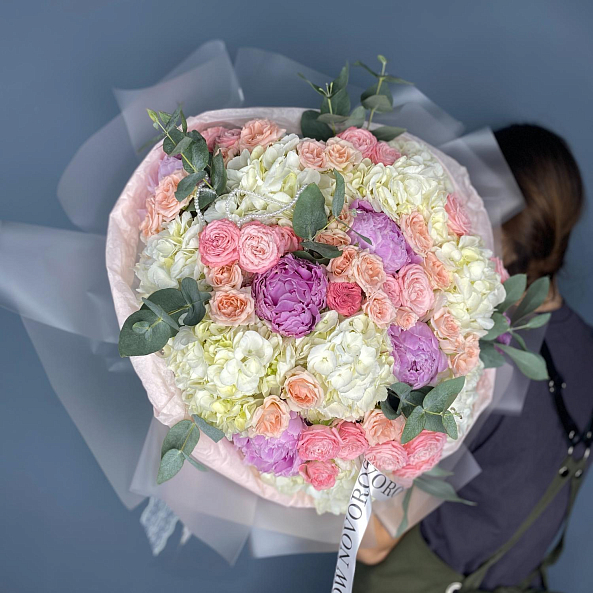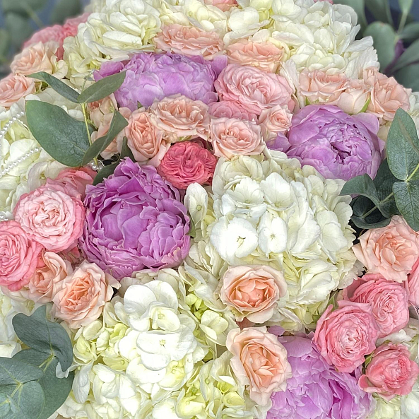 Воздушный и нежный букет в пастельных тонах: розовые, персиковые и белые розы, пышные гортензии и фиолетовые пионы. Дополнен свежей зеленью эвкалипта и изящной жемчужной лентой — идеальный выбор для романтического подарка или особенного праздника.