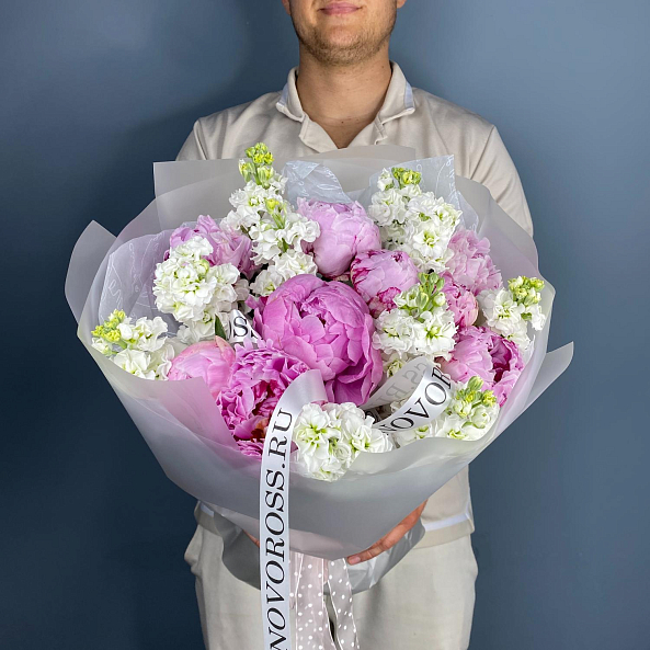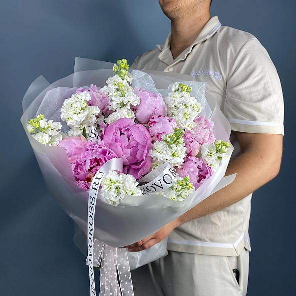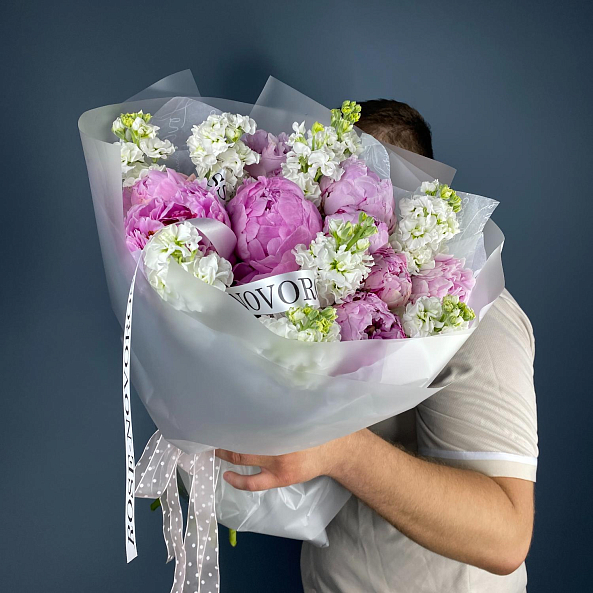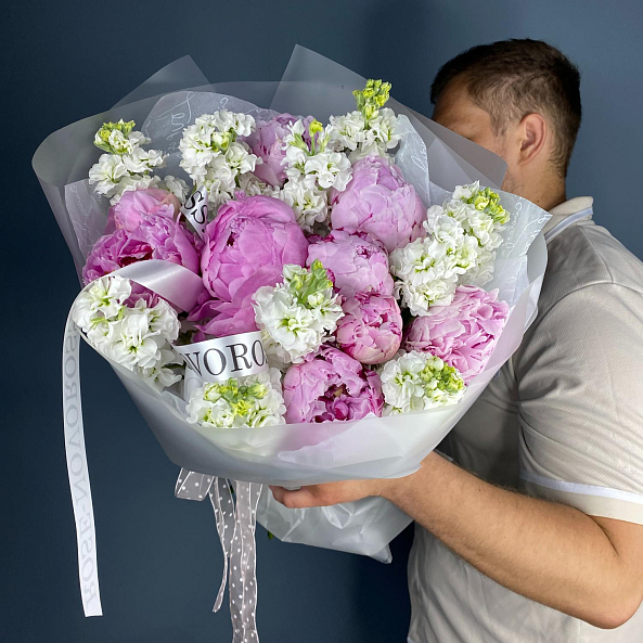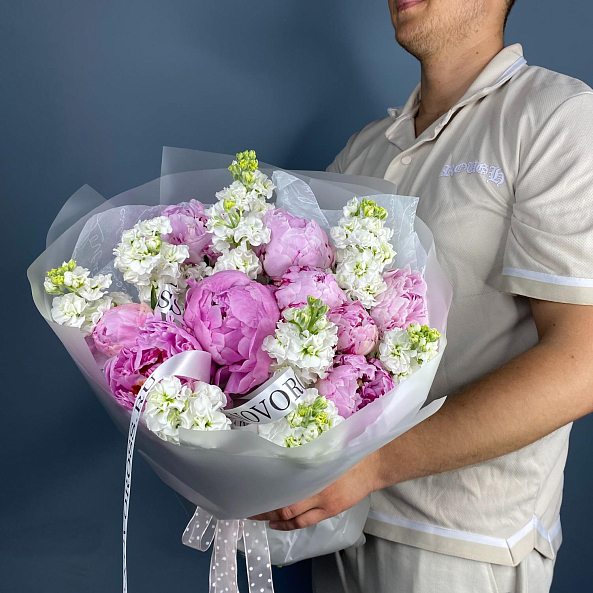 Букет из розовых пионов и белой маттиолы в стильном оформлении — нежная и изысканная композиция, сочетающая тепло и свежесть. Идеальный подарок для романтических моментов, поздравлений и выражения заботы.