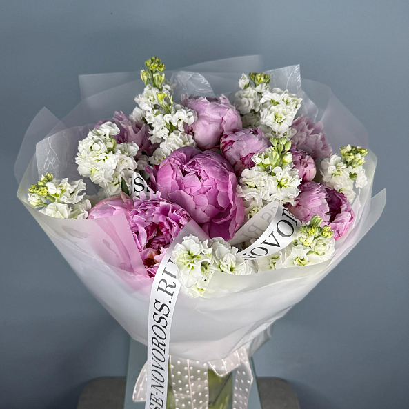 Букет цветов. Пионы "Сара Бернар", Маттиола.