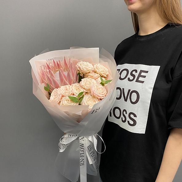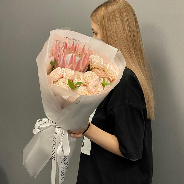 Этот букет — не просто цветы, а настоящая история: пышные кремово-розовые розы, словно вырезанные из атласа, и величественная протея с нежно-розовыми чашелистиками создают образ изысканной, но мягкой роскоши.